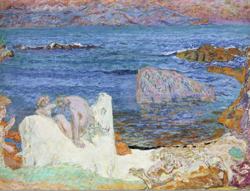 El cierre de la muestra – que cuenta también con dibujos y fotografías tomadas por Bonnard con una sencilla Kodak – lo dan sus trabajos de mayor formato: sus vistas idílicas de los paisajes de la Costa Azul y Normandía, más líricas que naturalistas, y varios murales que realizó por encargo. En ellos lo real se mezcla con lo fantasioso y lo mitológico.