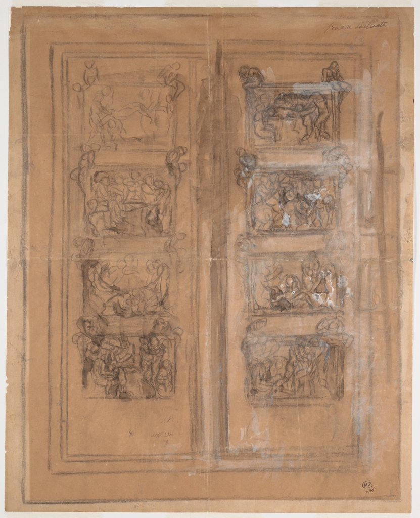 De Dante le interesó lo oscuro, atormentado y febril, el Infierno. Comenzó con los bocetos, siguiendo de forma más o menos literal el texto del poema, pero muy pronto empezó a modelar los personajes principales, Paolo y Francesca, Ugolin y sus hijos, las Sombras o el Pensador, entre una multitud de tallas diversas. Estas figuras y grupos que recubren la estructura arquitectónica de la puerta las llevaba a cabo de forma independiente, las probaba sobre las hojas de la puerta, formadas por rectángulos de madera, y luego las dejaba a un costado.