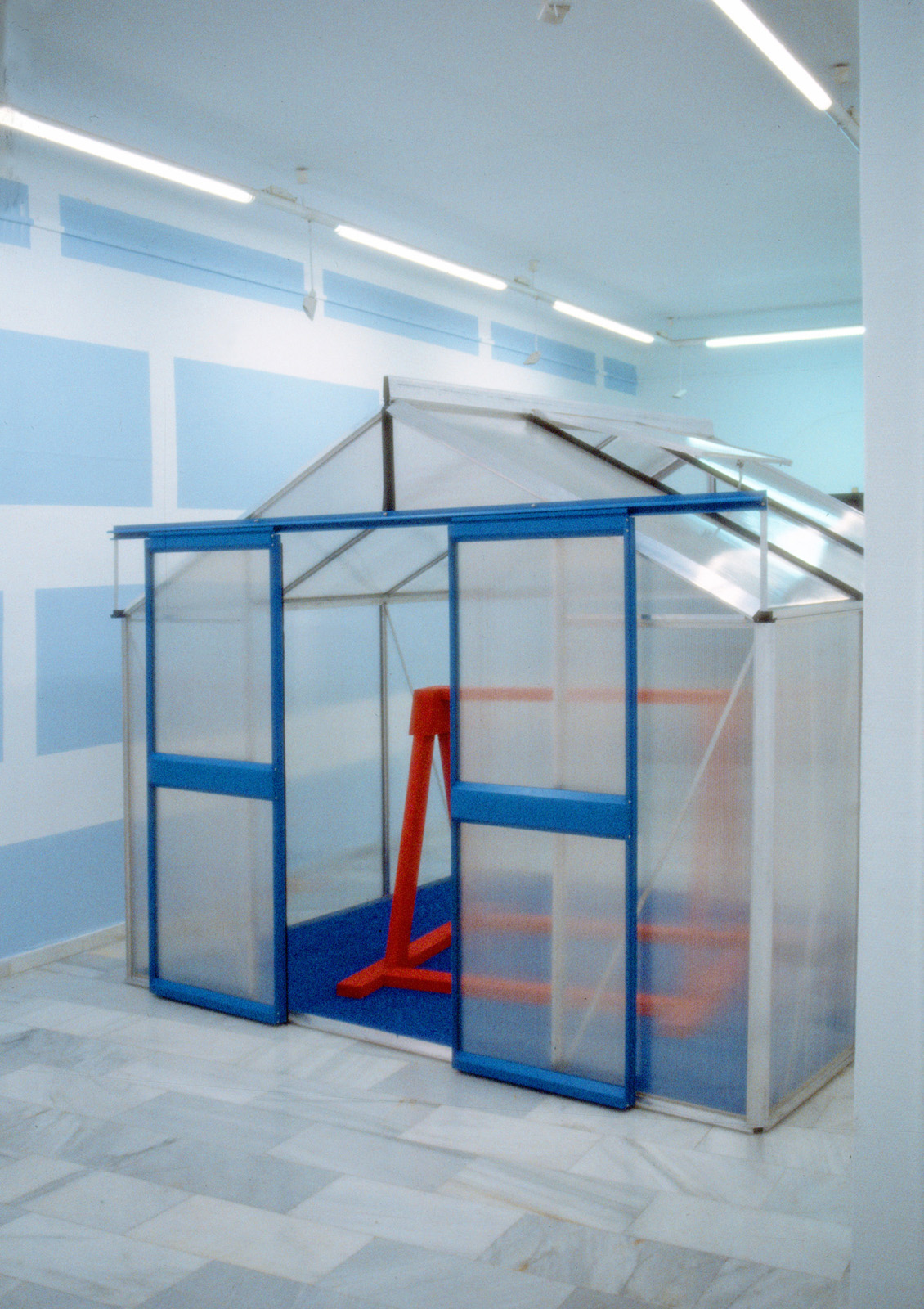 La elección y disposición de los instalaciones se ha pensado en función de ese dispositivo, que además de ser encaje de las obras, tiene, en palabras de Irazu, identidad propia y se proyecta en fondo y lugar para alcanzar un poso de trascendencia. Su cercanía violenta lenguajes ya asentados en cada pieza, dentro de un nuevo mecanismo creativo del artista en el que los murales se relacionan, no sólo con la arquitectura circundante, también entre ellos.