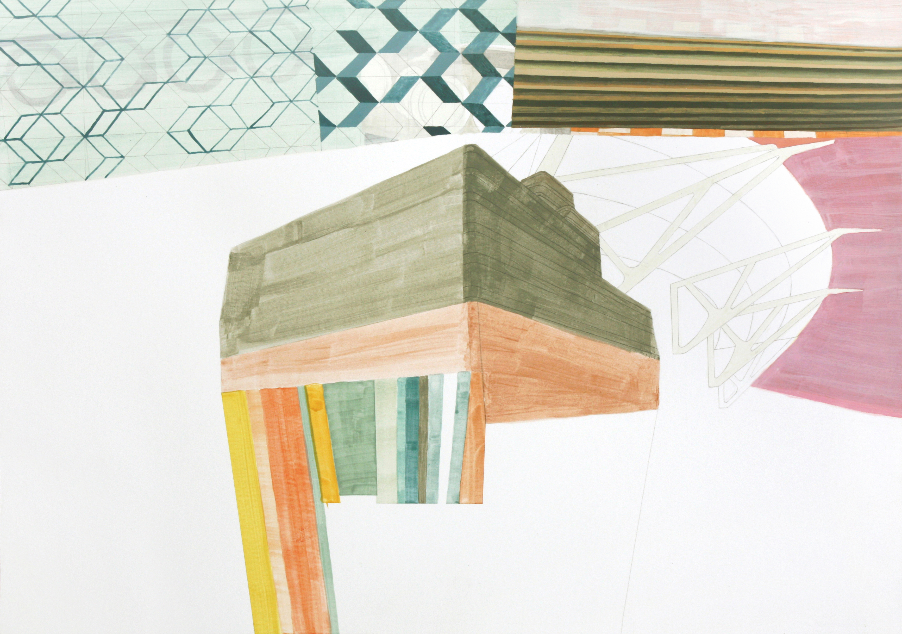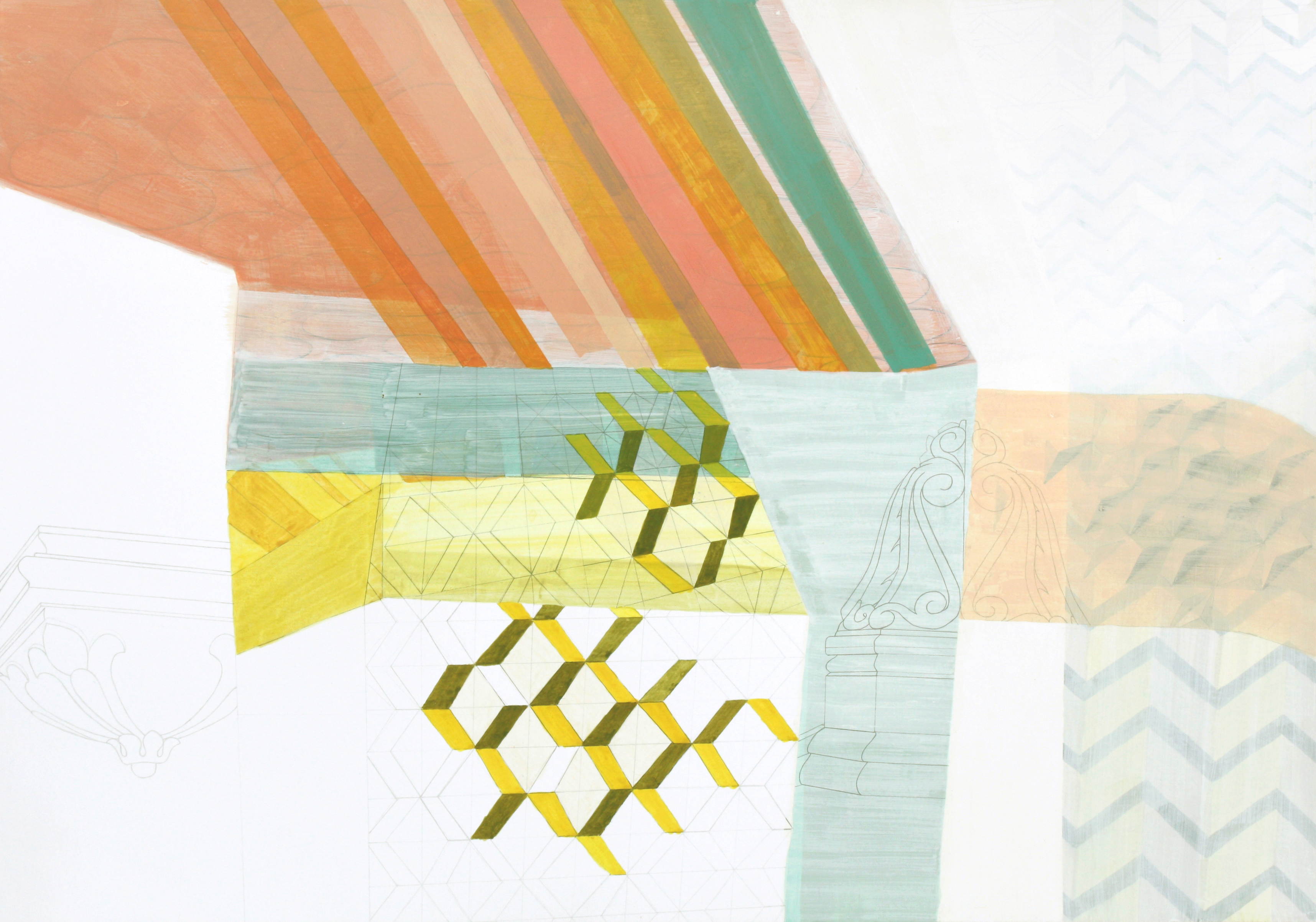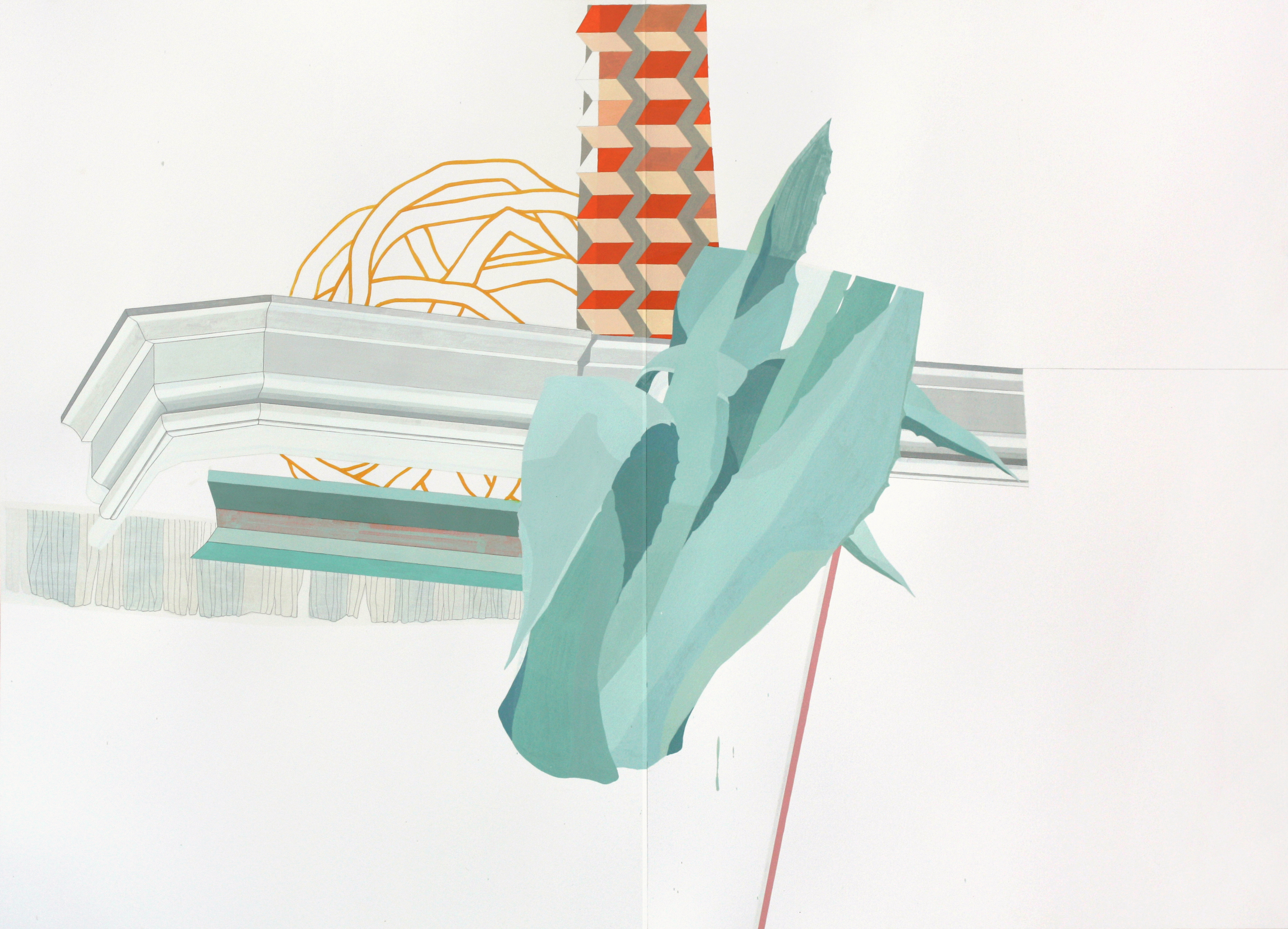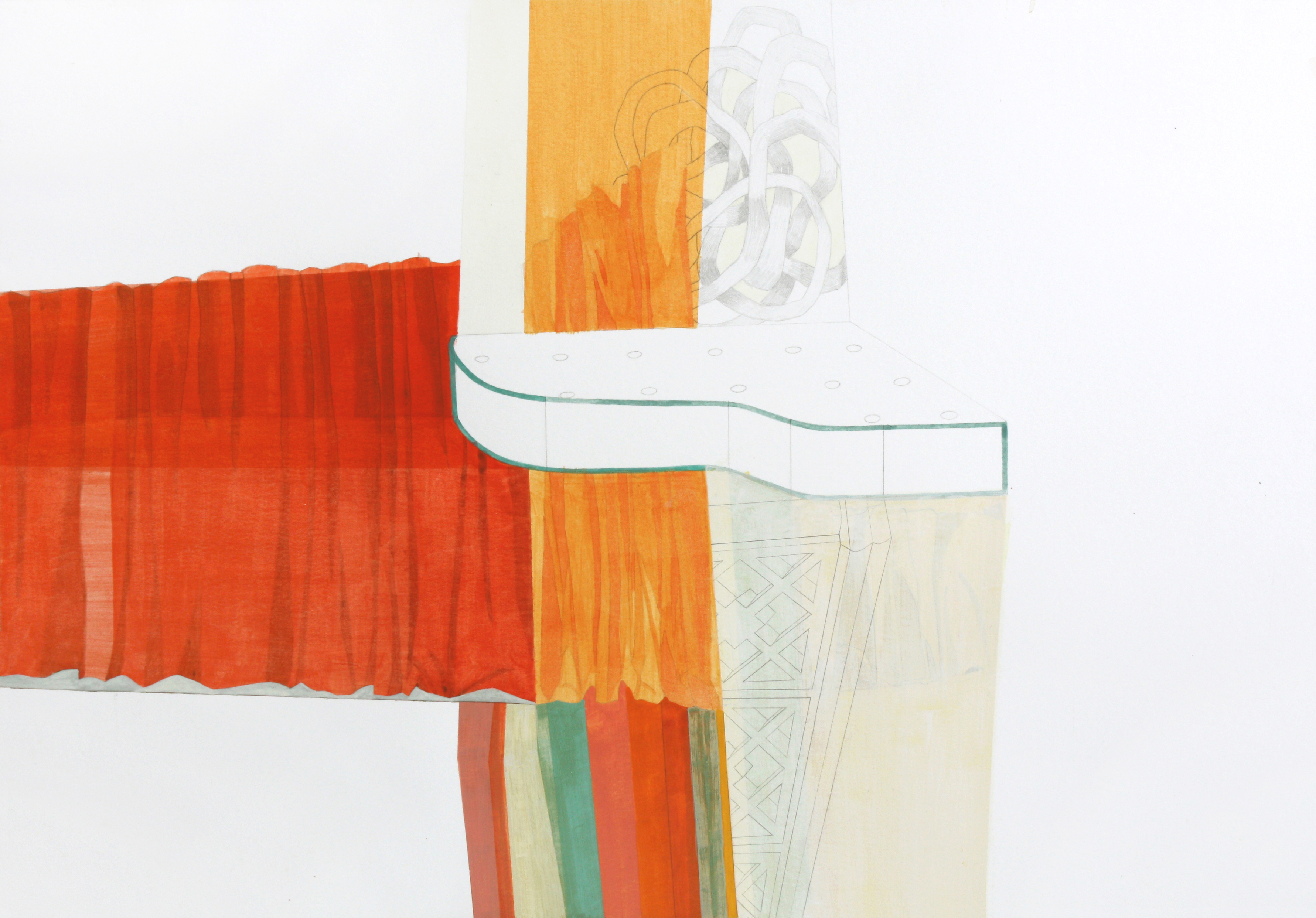 Lo vemos en las piezas de las series que os enseñamos aquí: Drapeados y Entornos; en la primera vemos telas que se acomodan unas a otras como estratos y que, por sus pliegues, sabemos que pesan; en la segunda, anterior en el tiempo, encontramos paisajes exteriores dominados por formas geométricas en los que ganan presencia las formas vegetales y lo decorativo, siempre en el marco de entramados lineales. Nos gustan sus tonalidades siempre suaves, sus juegos volumétricos precisos y su dominio del dibujo técnico.