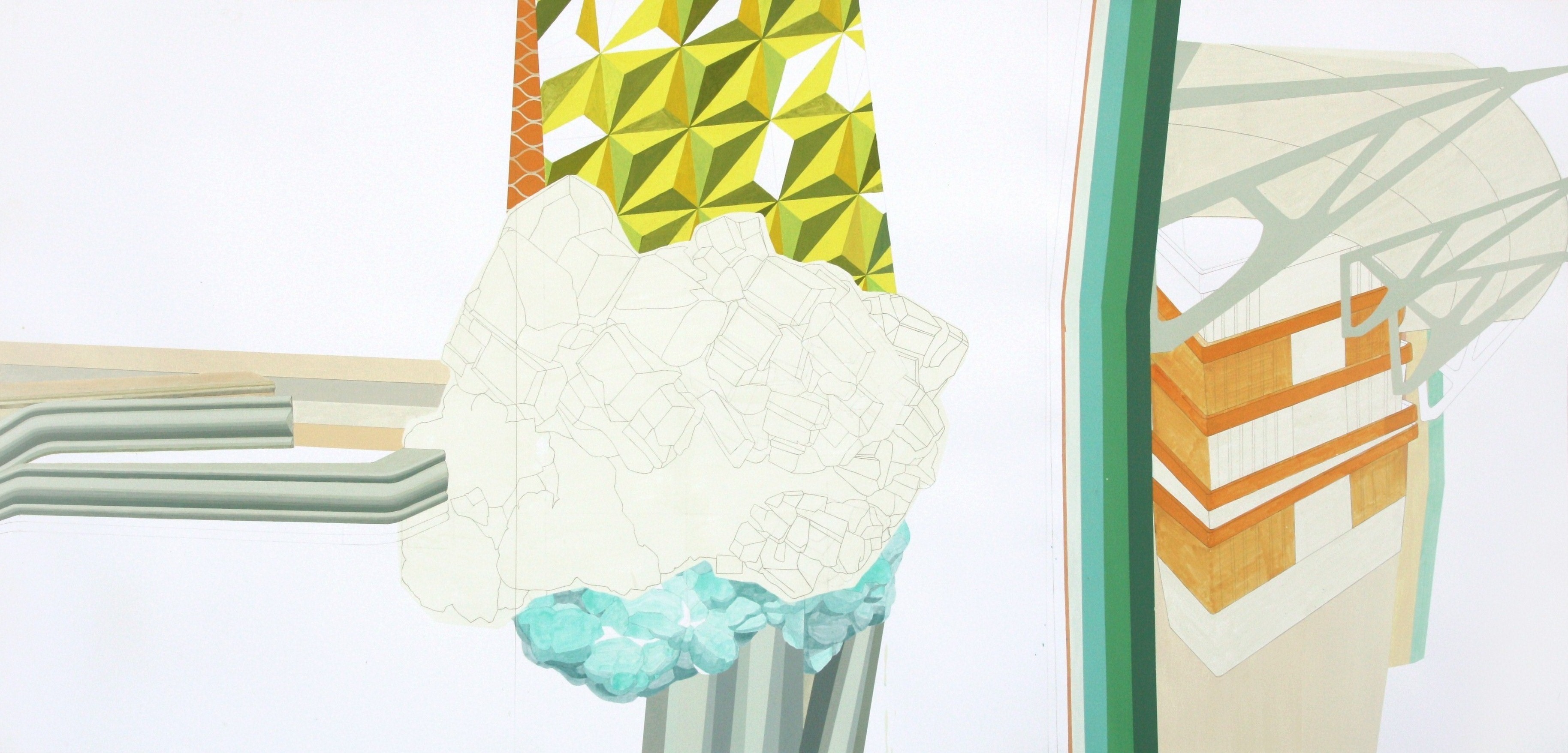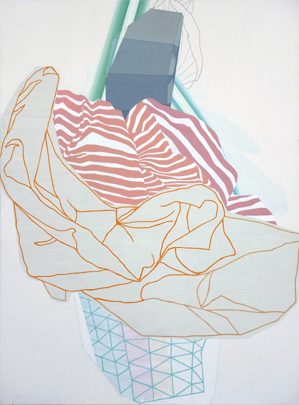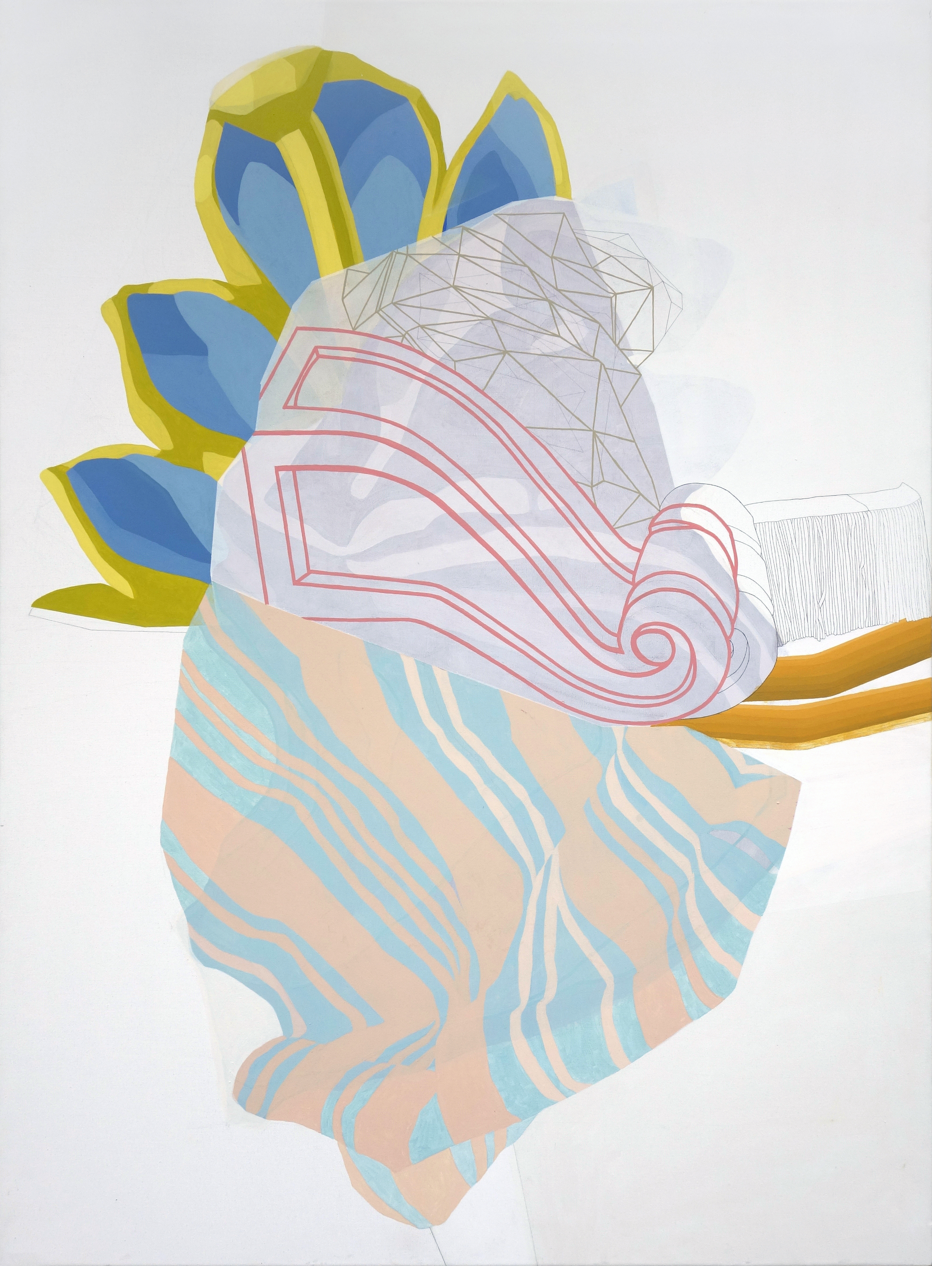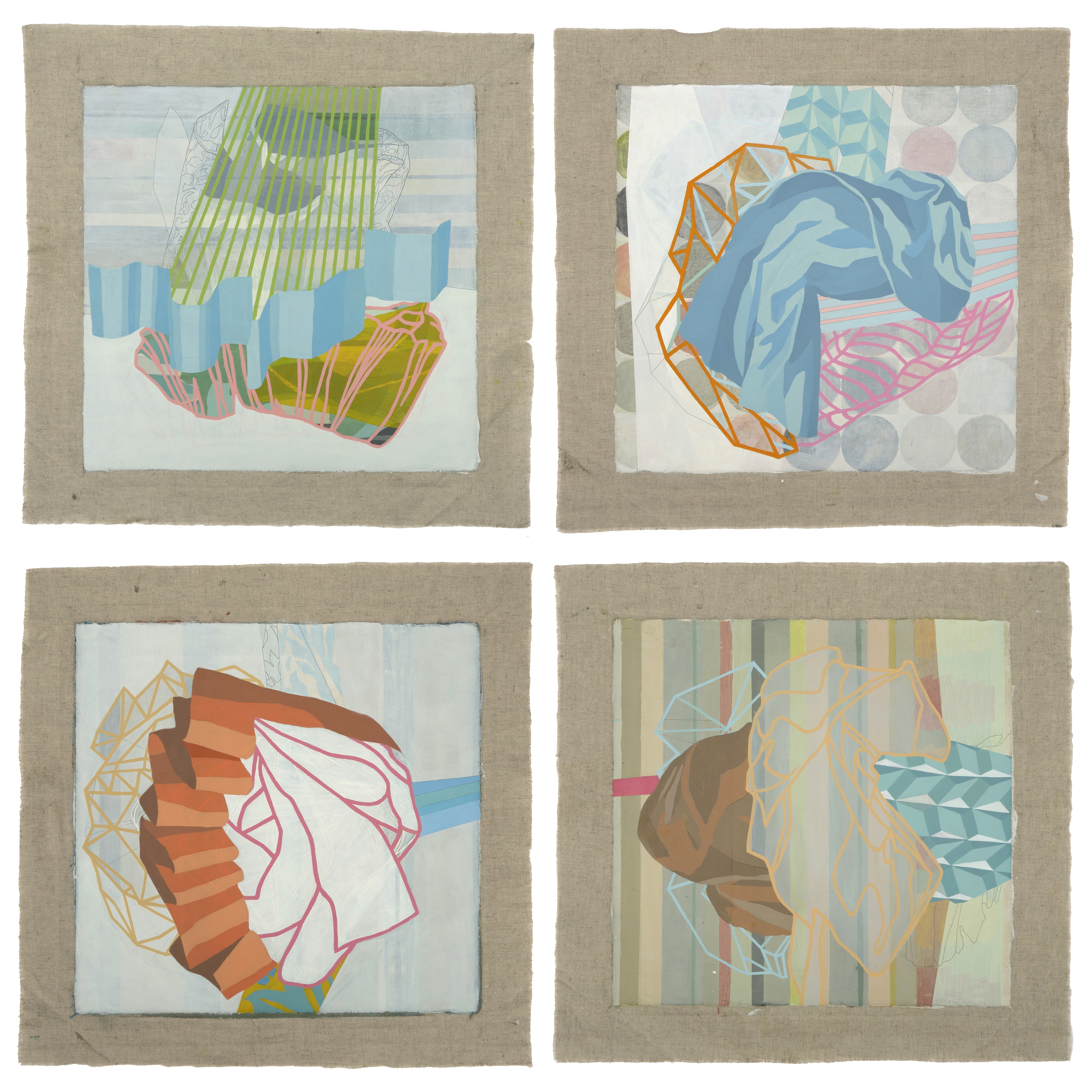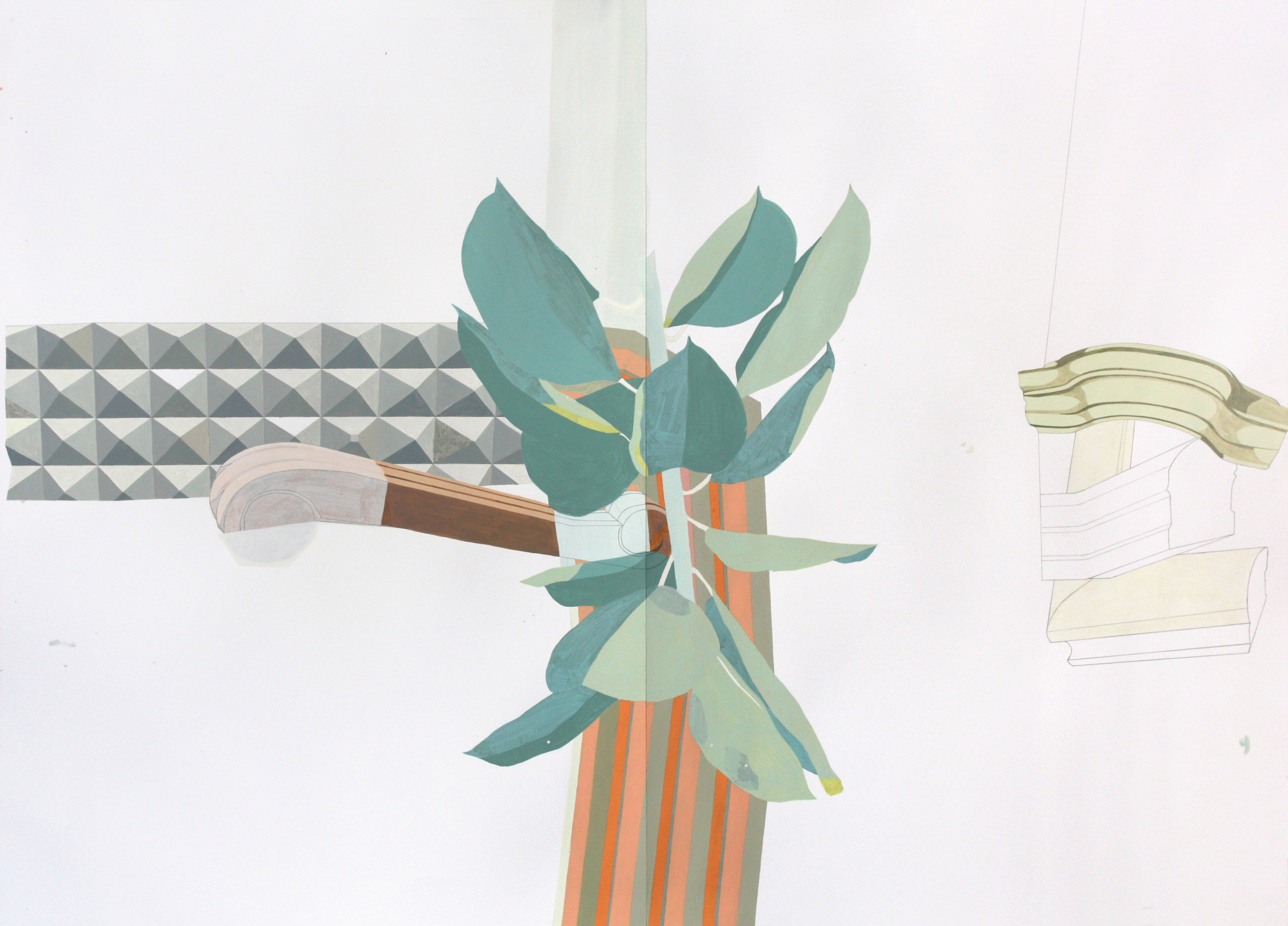Lo vemos en las piezas de las series que os enseñamos aquí: Drapeados y Entornos; en la primera vemos telas que se acomodan unas a otras como estratos y que, por sus pliegues, sabemos que pesan; en la segunda, anterior en el tiempo, encontramos paisajes exteriores dominados por formas geométricas en los que ganan presencia las formas vegetales y lo decorativo, siempre en el marco de entramados lineales. Nos gustan sus tonalidades siempre suaves, sus juegos volumétricos precisos y su dominio del dibujo técnico.