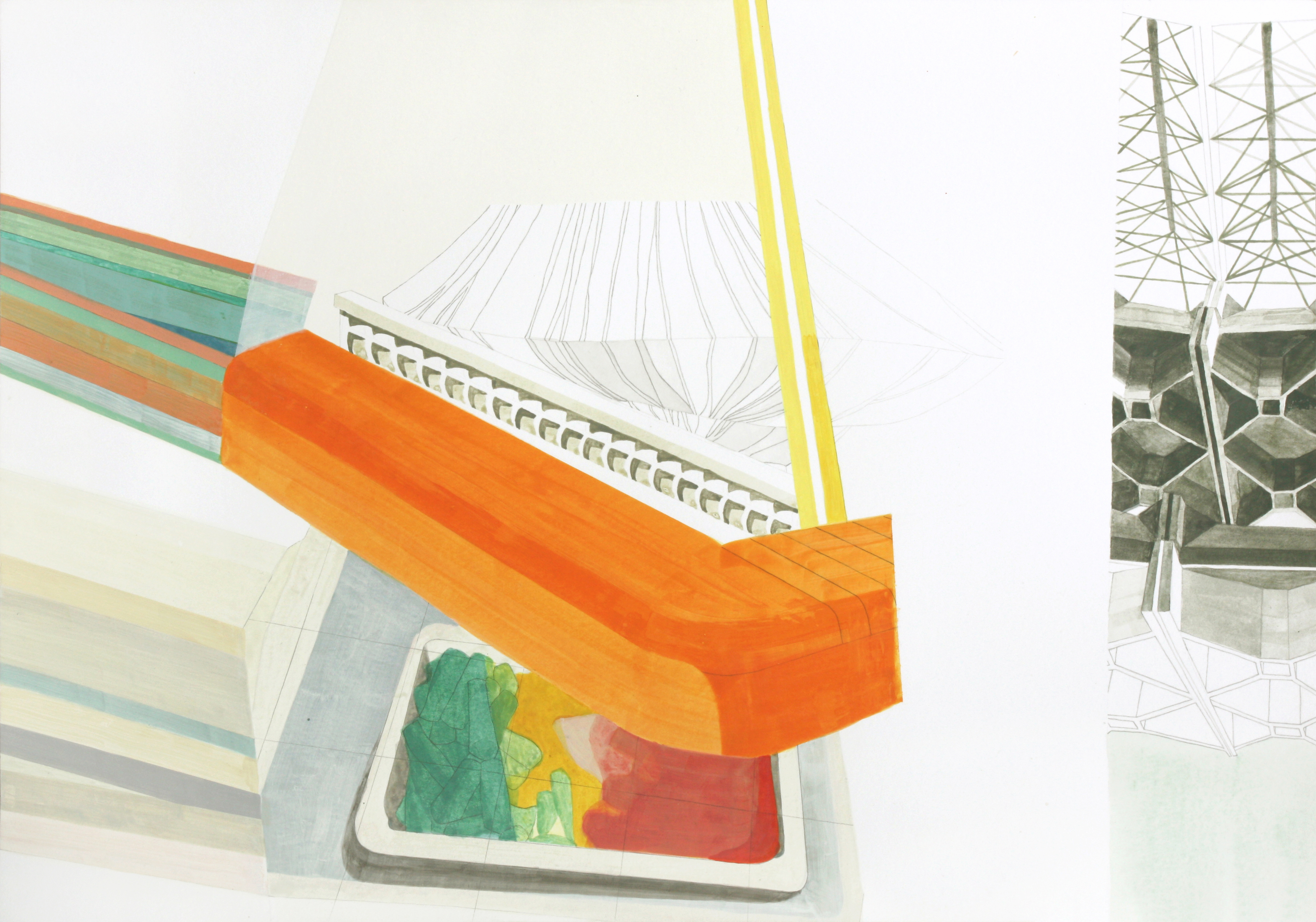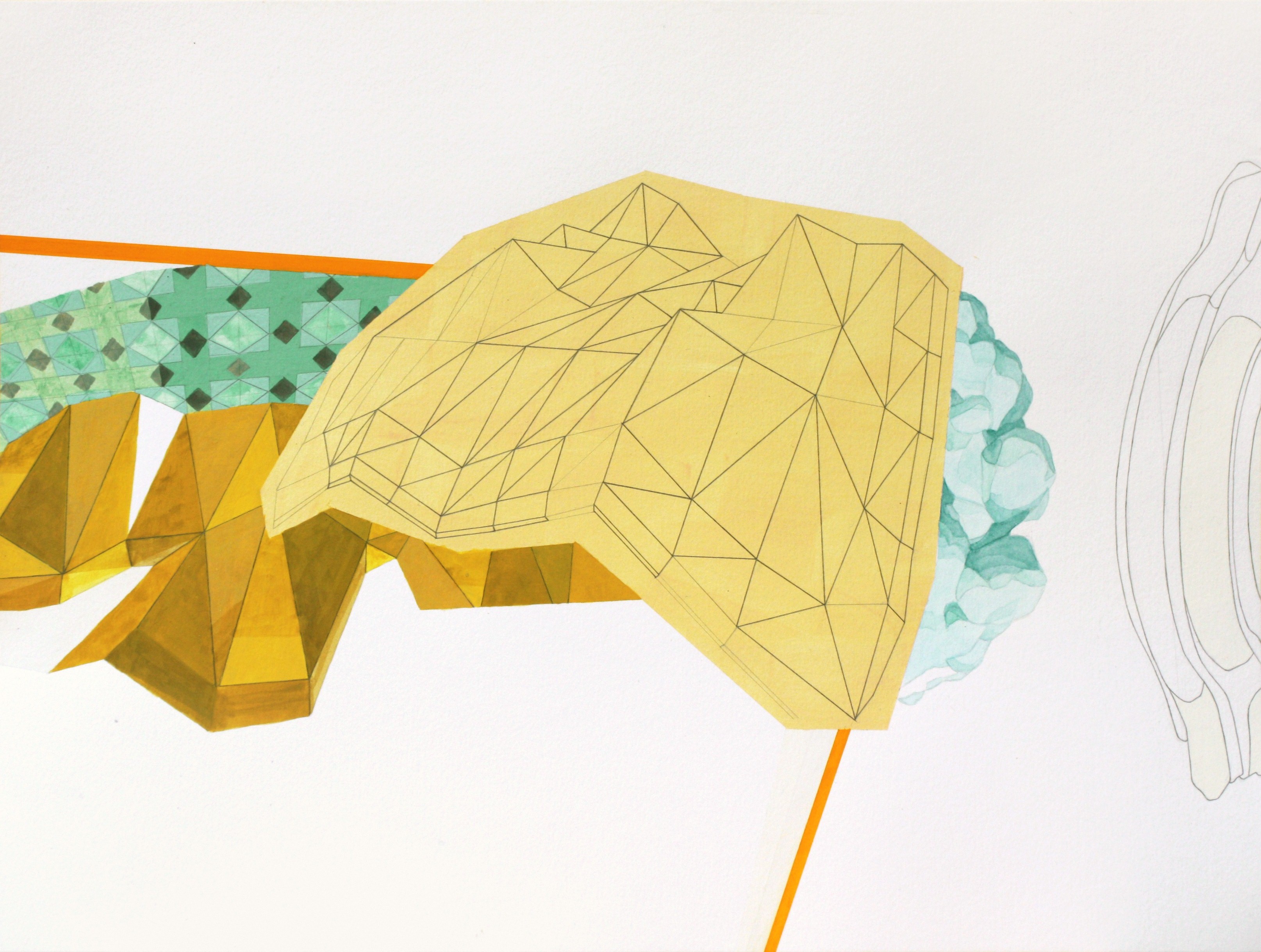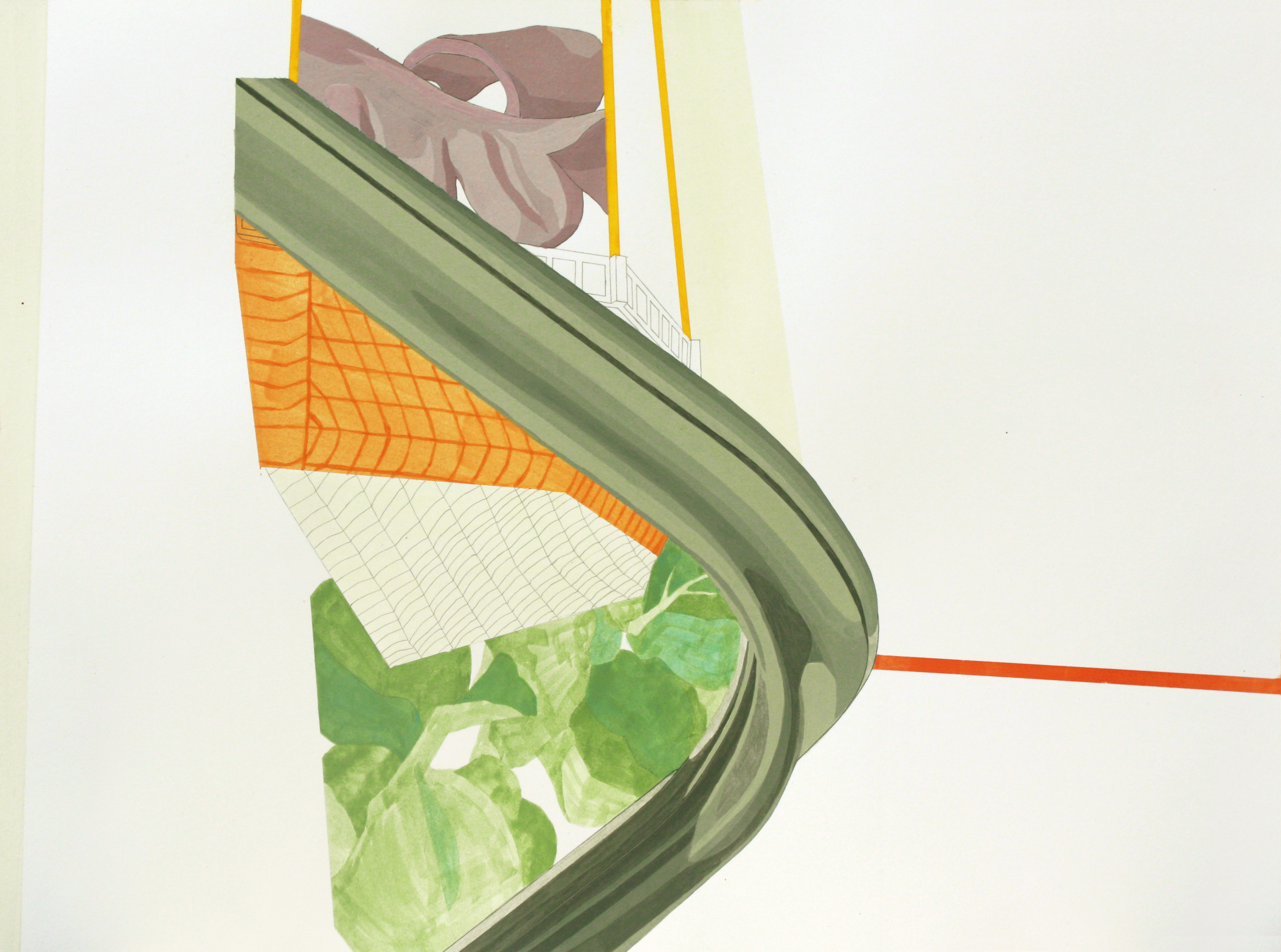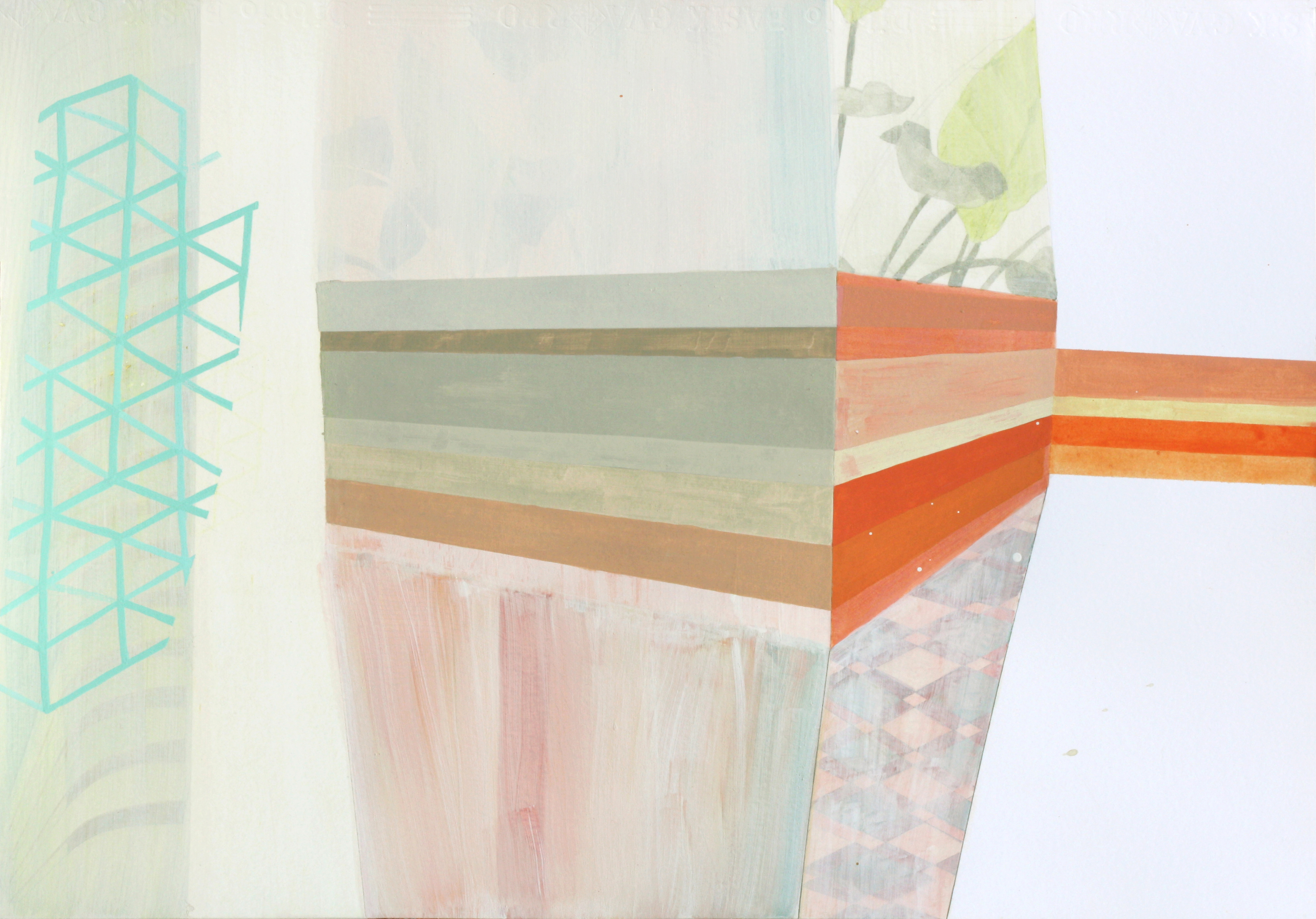 Lo vemos en las piezas de las series que os enseñamos aquí: Drapeados y Entornos; en la primera vemos telas que se acomodan unas a otras como estratos y que, por sus pliegues, sabemos que pesan; en la segunda, anterior en el tiempo, encontramos paisajes exteriores dominados por formas geométricas en los que ganan presencia las formas vegetales y lo decorativo, siempre en el marco de entramados lineales. Nos gustan sus tonalidades siempre suaves, sus juegos volumétricos precisos y su dominio del dibujo técnico.