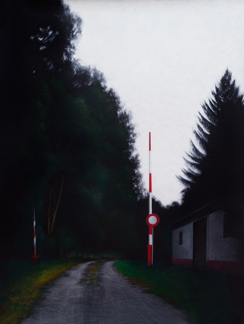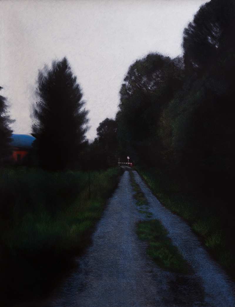 En mis dibujos y pinturas, la atención se centra casi exclusivamente en los elementos que simbolizan el recorrido entre dos realidades: pasajes, umbrales, corredores e incluso puertos o puestos de frontera. Mi interés en esos enclaves radica en su carácter intersticial y de indefinición, metáfora del estado de liminalidad, apertura y ambigüedad propias de quien en ellos experimenta un cambio significativo o abrupto.