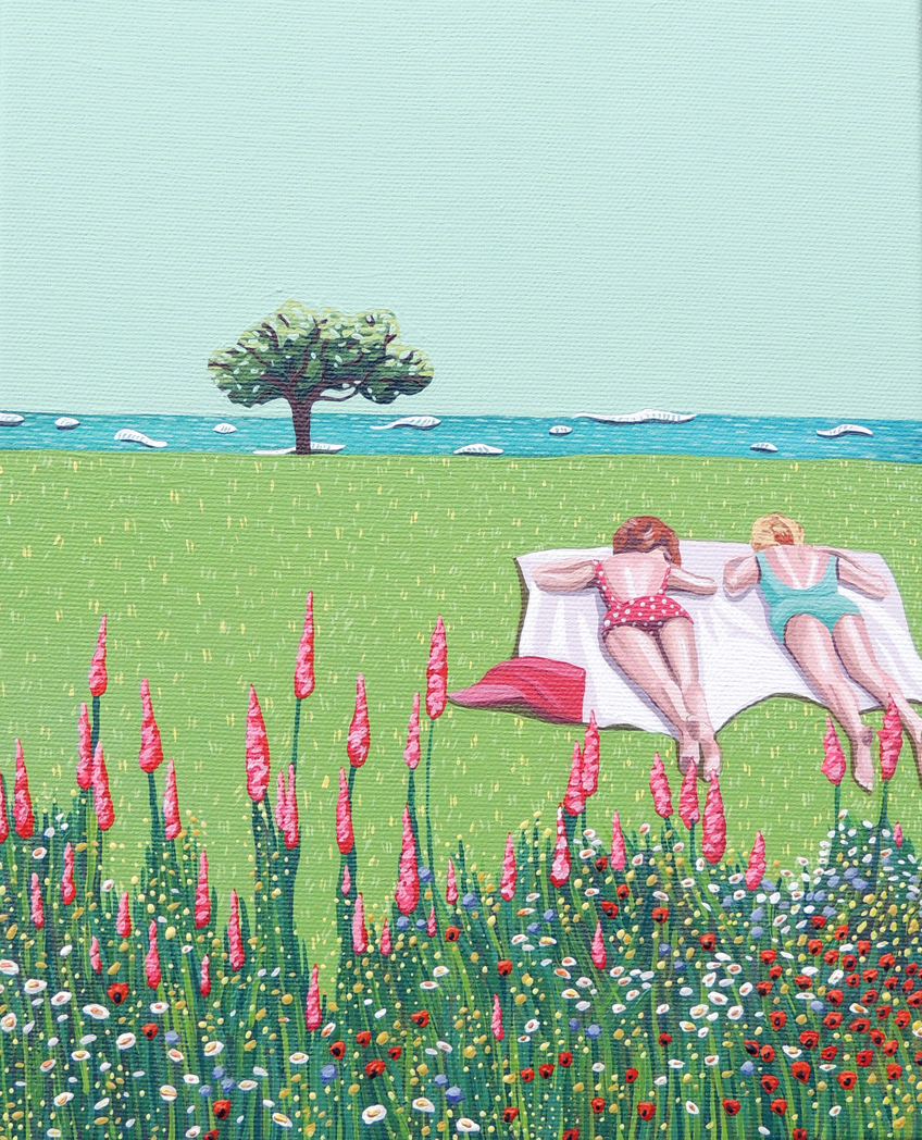 Es posible que algunos conozcáis, además de sus pinturas, su voz y el sonido de su guitarra, porque desde hace cinco años forma parte, junto con Nel González, de Los Bonsáis, y ya han publicado en Elefant Records “Ultramarinos” (2012), “Martín Pescador” (2013), “Nordeste” y “¡Fanzine!” (2015). Por supuesto, Helena se encarga también de su imagen: ha creado videoclips, fotografías y demás trabajo artístico. Pero ese no es el único enlace entre su actividad plástica y la musical: Nuestras canciones concuerdan bastante bien con mi obra pictórica: música pop, con melodías alegres y coloridas, letras cotidianas… A veces he realizado cuadros a partir de canciones y viceversa. Es muy divertido y satisfactorio. Es interesante llevar a cabo la misma idea de dos formas diferentes: en forma de cuadro y en forma de canción. (…) Tenemos varios vídeos pero, en concreto, “Serín” tiene unos cuantos planos que bien podrían ser cualquiera de mis cuadros.