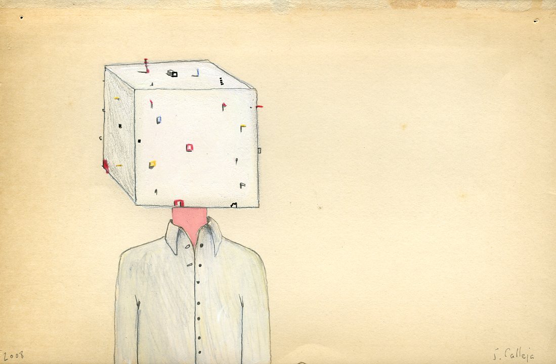 Los personajes de cabezas cúbicas que pueblan los microcosmos de Calleja plantean desde un enfoque fresco las relaciones entre figura humana y entorno: al empequeñecerse las primeras, cuerpo y objeto parecen entrelazarse hasta quedar fundido el primero en el segundo.