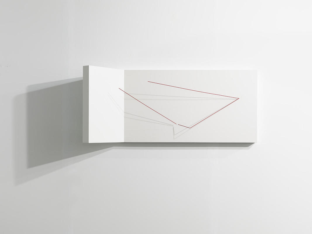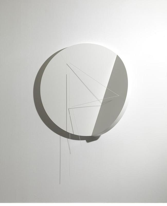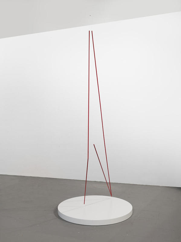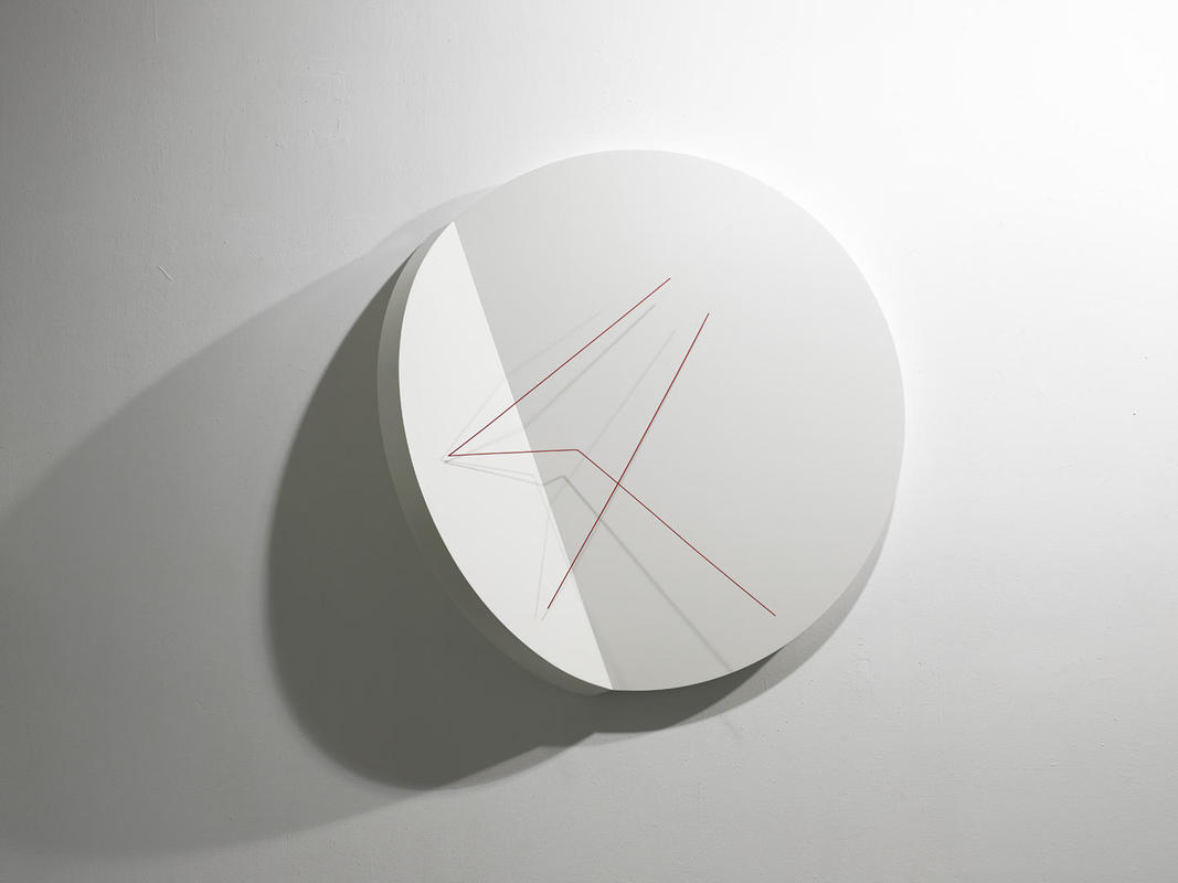La exposición reúne dos conjuntos de obras: uno, monocromático en blanco, y el otro bicromático en rojo y blanco. El asturiano se ha servido de distintos soportes -siempre blancos- con las formas básicas más tradicionales de su repertorio (circunferencias o rectángulos, a los que ha añadido elementos en forma de ele, circunferencias quebradas o formas cóncavas) y ha elevado, mediante campos magnéticos, una varilla frente o sobre la obra. Además de este elemento flotante, las esculturas se componen de un soporte fijo sustancial y definitorio de su escultura, porque es sobre este fondo donde se lee la varilla (y su sombra) y porque la delimita en el espacio.