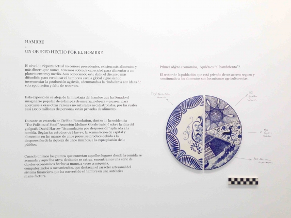 Precisamente en la Delfina Foundation, durante la residencia “The Politics of Food”, Molinos trabajó sobre la idea del geógrafo David Harvey de acumulación por desposesión aplicada a la comida. Como la artista nos recuerda, el nivel de riqueza actual no conoce precedentes y existen más alimentos y más dinero que nunca. Realmente tenemos sobrada capacidad para alimentar a este planeta y que sobre, pero, aún a sabiendas de este dato, el discurso más difundido para erradicar el hambre a escala global sigue siendo incrementar la producción agrícola. La creadora plantea por ello si nos encontramos ante un problema de escasez y crisis económica mundial o ante un problema de distribución de los recursos derivado de una política económica llena de intereses privados.