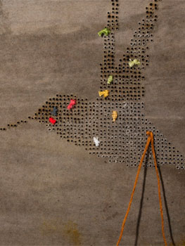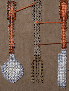 Los objetos sobre los que la chilena llama nuestra atención son aquellos que, por vistos, por formar parte de nuestra realidad más cercana, han pasado a ser ya invisibles: cuchillos perforados y bordados, jarras, tazas, platillos…que en Ángeles Baños se nos presentan como presencias fantasmales que esperan ser recuperadas. Son ejemplos, ellos mismos, de la fragilidad de nuestra memoria.