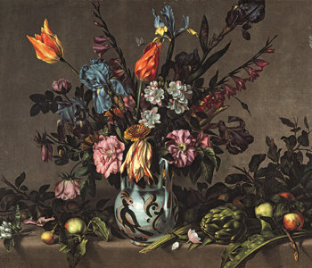 - Antonio Ponce. Bodegón con jarrón de Talavera con flores, alcachofas y frutas. Colección Abelló