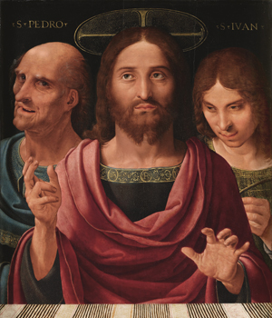 - Fernando Yáñez de la Almedina. Salvator Mundi entre San Pedro y San Juan. Colección Abelló
