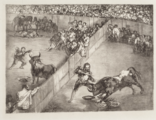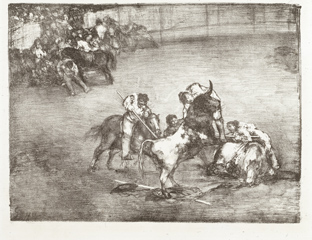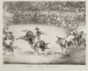 Piedras litográficas: El famoso americano Mariano Ceballos, Bravo toro, Dibersión de España y Plaza partida, 1825. Francisco de Goya. Estas cuatro estampas las realizó Goya en Burdeos un año después de su llegada a la ciudad francesa. Libertad formal y amor por lo trágico constituyen las notas dominantes de estos grabados.