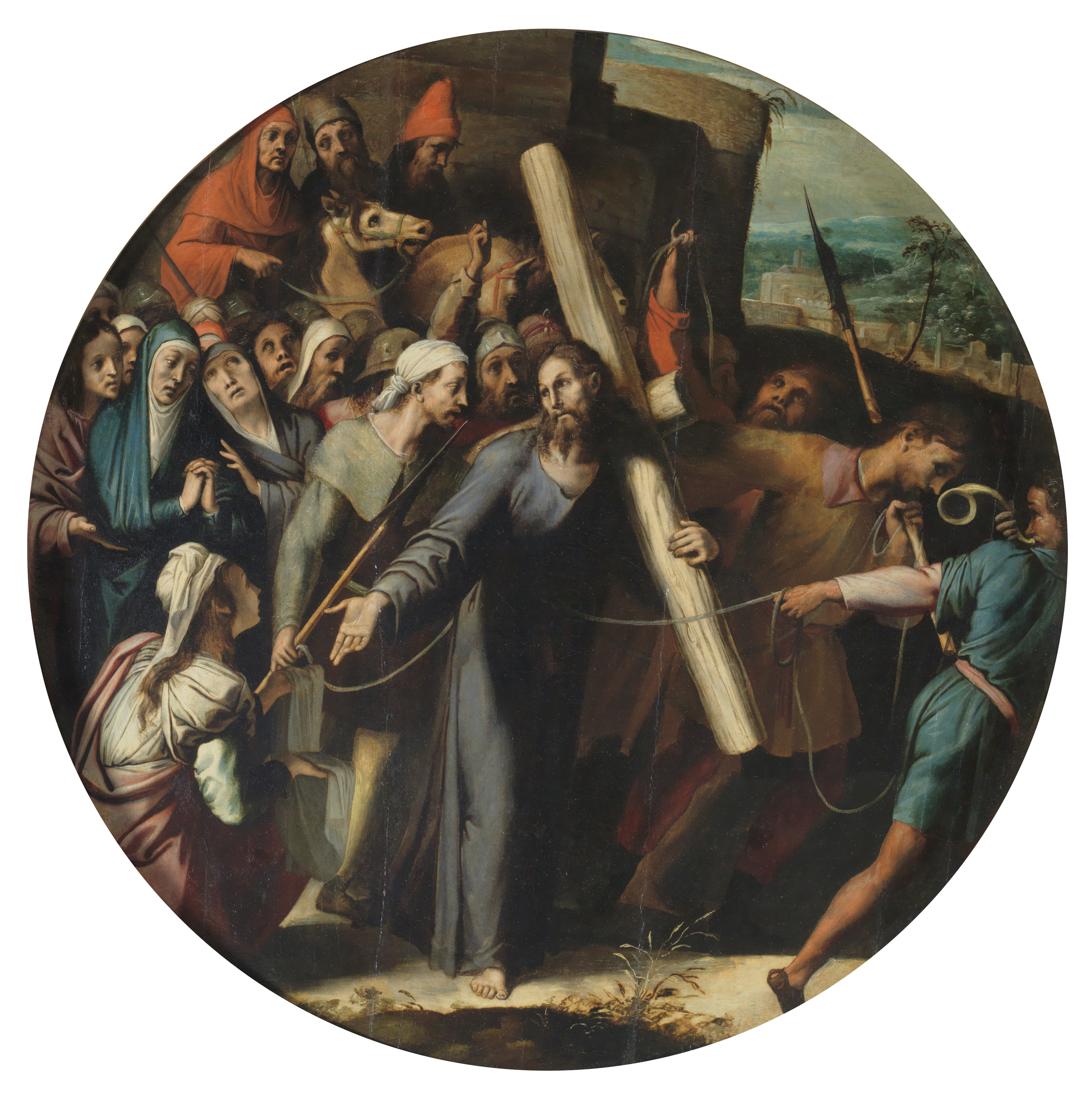 Camino del Calvario, hacia 1547. Pedro de Campaña. Junto a El Descendimiento, es la primera pintura de este artista de origen belga que se suma a los fondos del Prado. Formaba parte de un retablo privado en la iglesia del convento sevillano de Santa María de Gracia y está realizada sobre un tondo de madera. Este formato circular, además, no es muy frecuente en la pintura española.