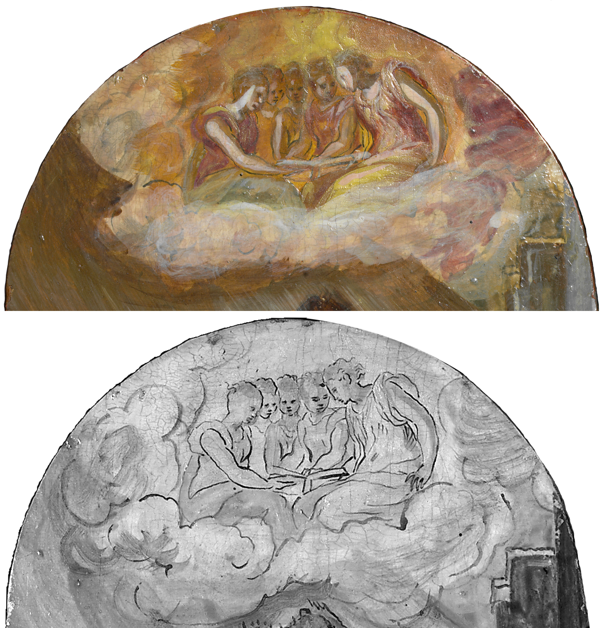 - Tríptico de Módena. Detalle coro en la parte superior de la tabla lateral izquierda: La Adoración de los pastores El Greco Óleo sobre tabla. 1567-68 Módena, Galleria Estense, inv. GE8095. Imagen visible y reflectografía infrarroja donde se ve el dibujo subyacente