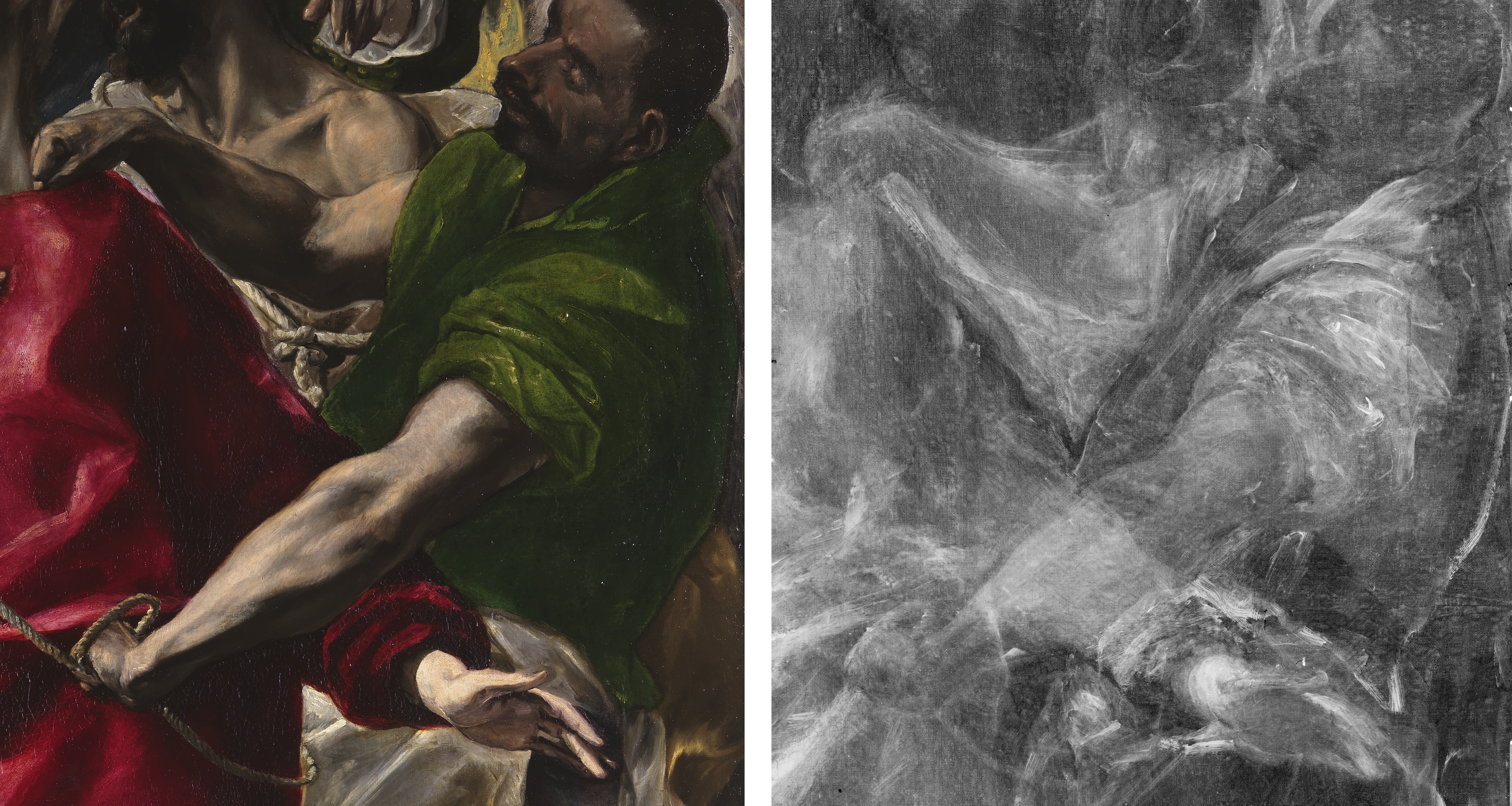 - El expolio (detalle). El Greco. Óleo sobre lienzo. 1577-79 Toledo, sacristía de la Catedral. Imagen visible y rayos X con cambios en la composición.