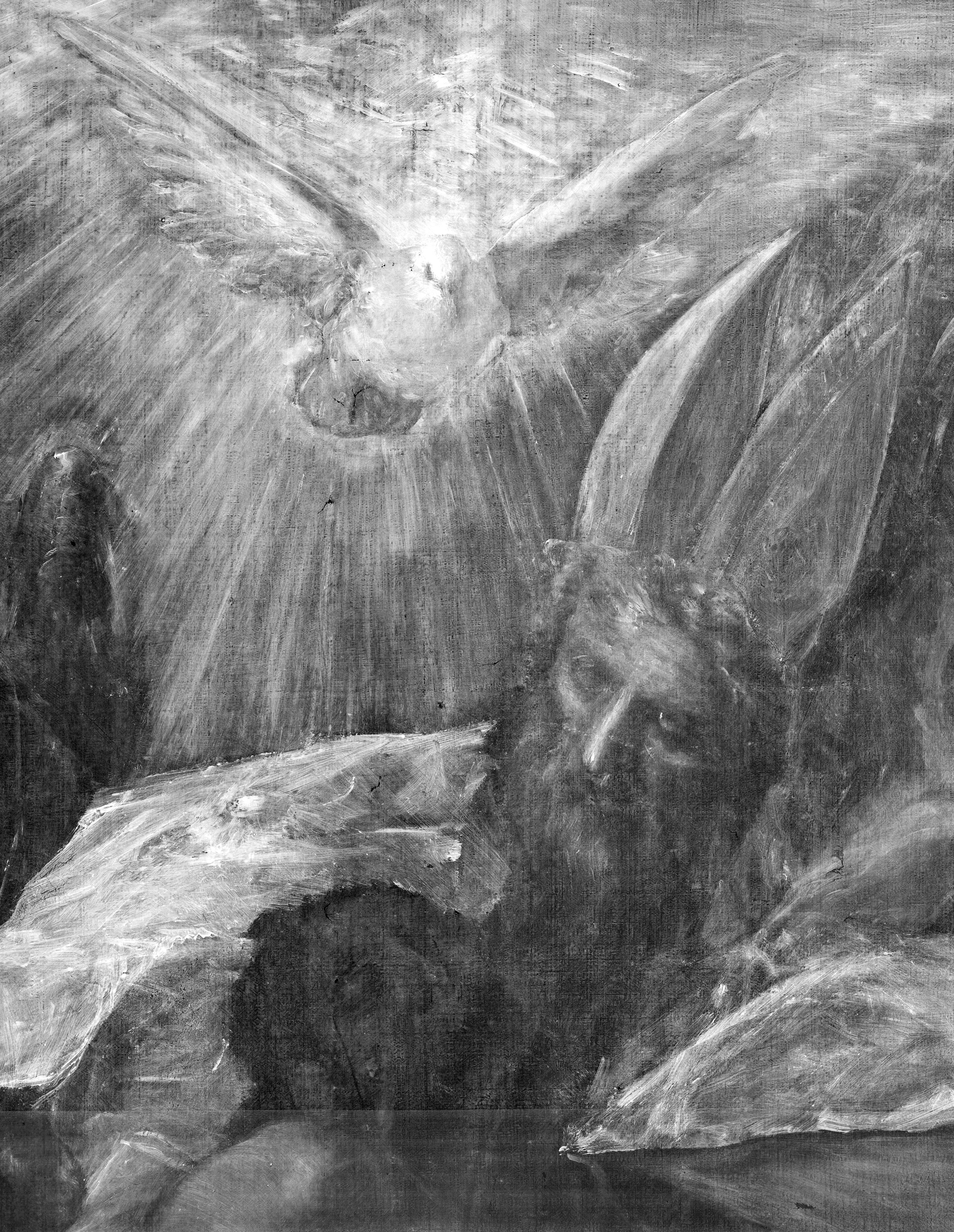 - El expolio (detalle). El Greco. Óleo sobre lienzo. 1577-79 Toledo, sacristía de la Catedral. Imagen visible y rayos X con cambios en la composición