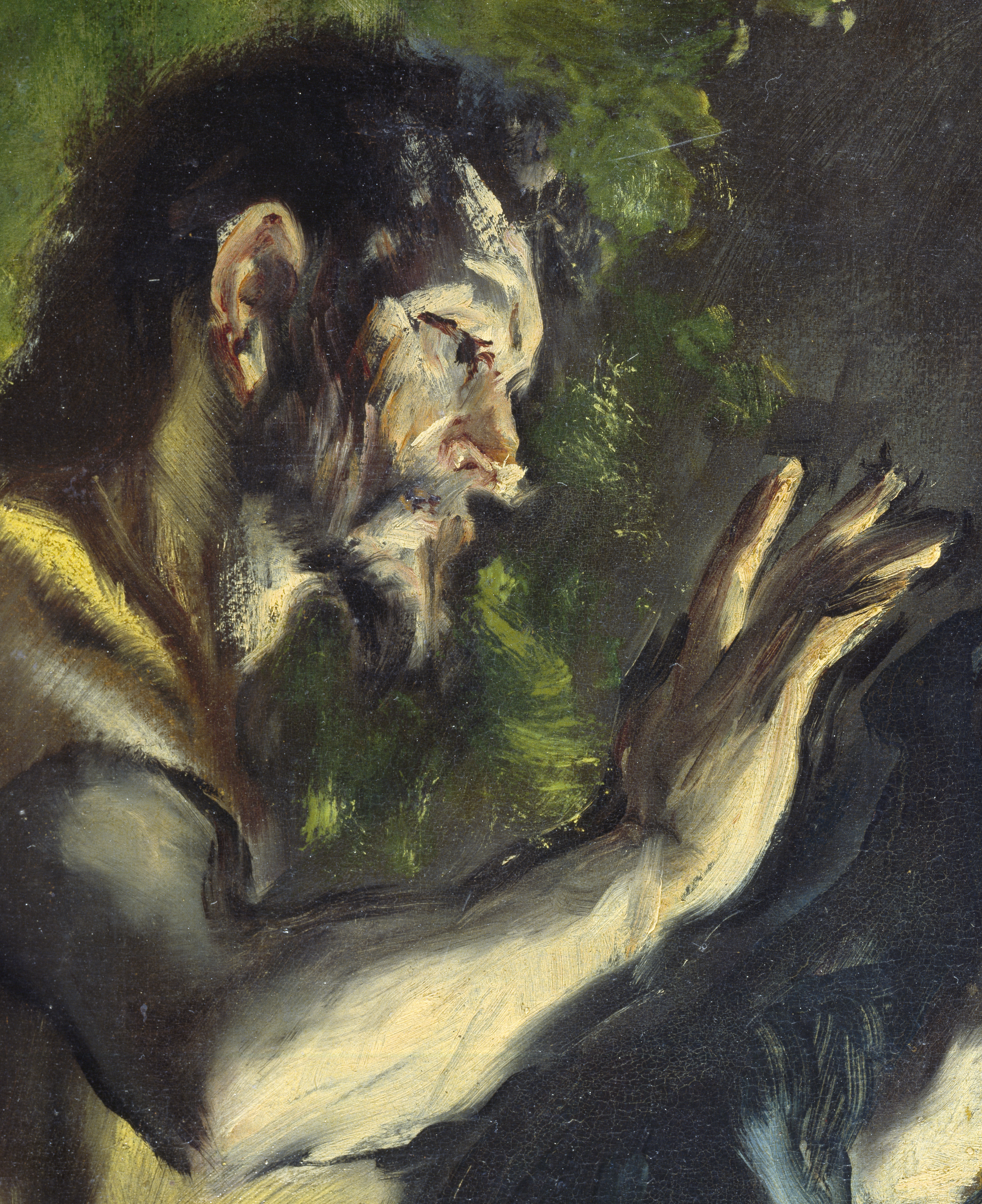 - La Adoración de los pastores (detalle). El Greco. Óleo sobre lienzo. 1596-1600 Madrid, Museo Nacional del Prado. Imagen visible. Personaje de la izquierda.