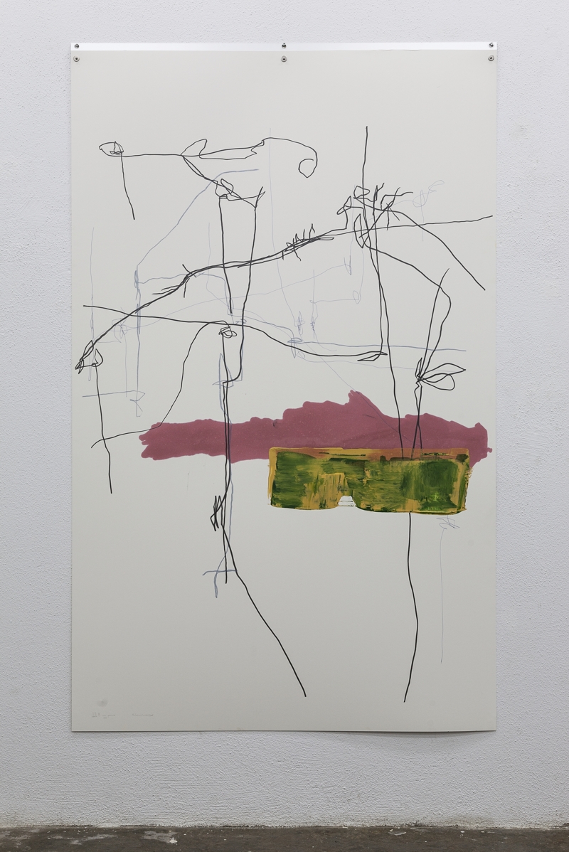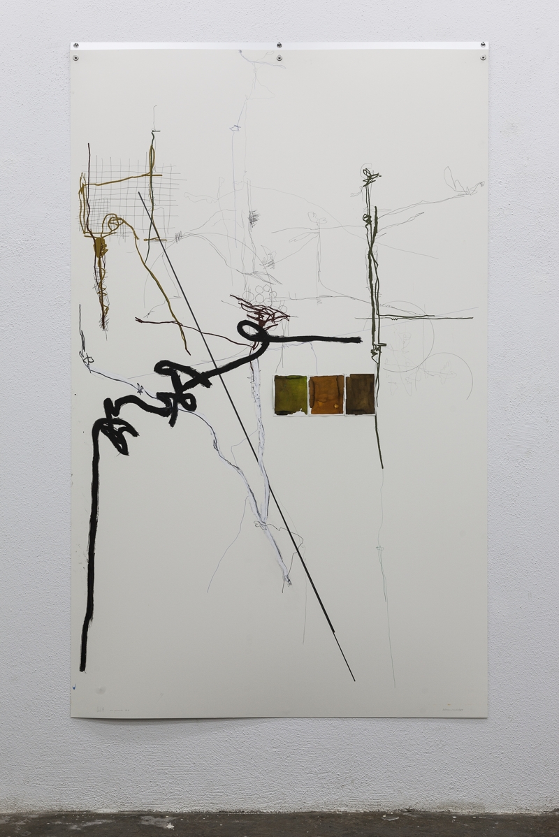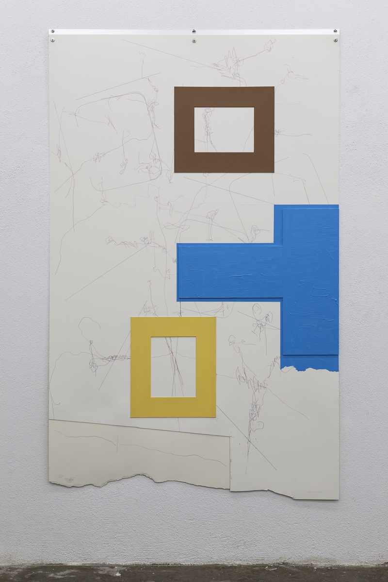 En sentido estricto y tradicional, no podemos hablar de estas piezas como “dibujos”, aunque el artista los llame clásicamente así: se trata de obras realizadas con grafito, oleo, barnices, acrílico, collage, esmaltes, lápiz de cera y bolígrafo y dispuestas directamente sobre la pared que, en esta muestra, adquieren cierto carácter objetual o escultórico. Para Cabrita Reis, el papel no es sólo el soporte de la obra, es también en sí mismo una materia tan importante como otras.
