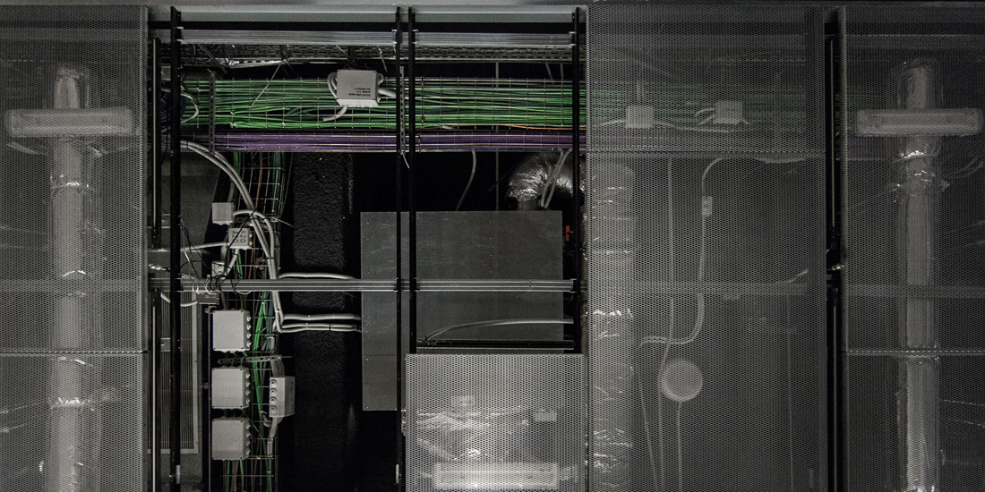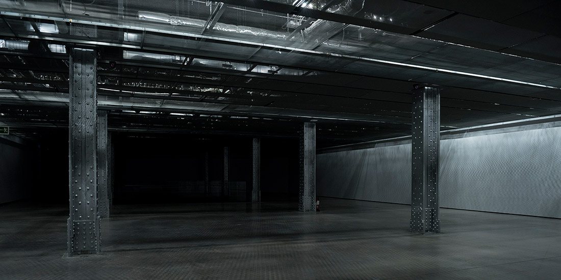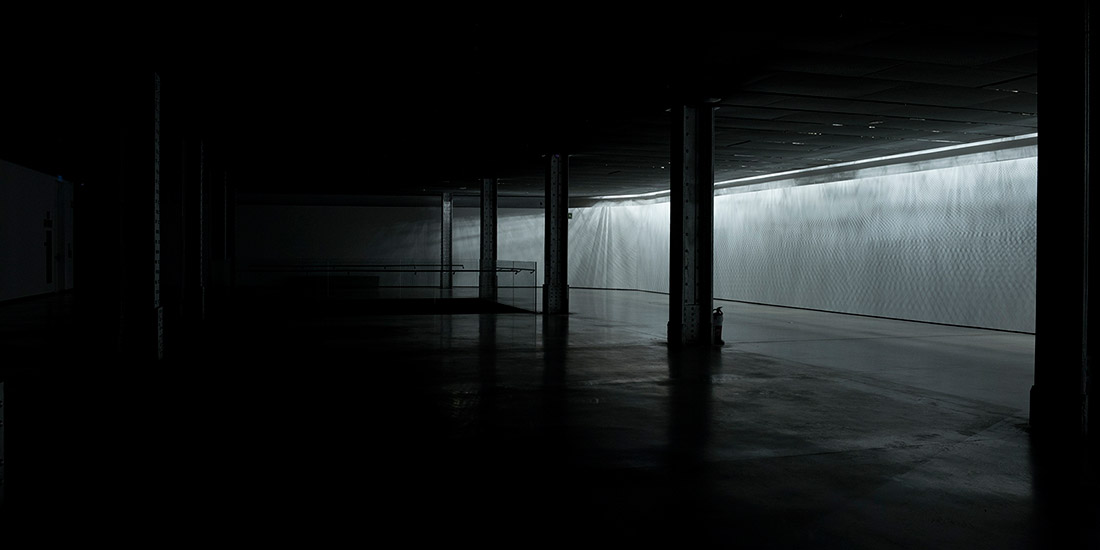 Un circuito de luz y sonido recorre el falso techo de la galería delineando los trescientos metros de cableado que distribuyen la electricidad de la sala y que resultan vitales para su uso y funcionamiento. De este modo, la intervención revela un paisaje de instalaciones que, pese a su relevancia funcional, se encuentra oculto a nuestra vista. Lo explica Pau Waelder: Los sistemas que definen las condiciones de la sala (iluminación, conectividad, temperatura), ocultos en el techo, se hacen presentes en las sombras proyectadas por la estructura de LEDs y altavoces que dan forma a la obra. Sombras y luces dibujan espacios y volúmenes efímeros en las paredes y columnas a medida que luz y sonido se desplazan por la sala, siguiendo patrones de movimiento y ritmos cambiantes.