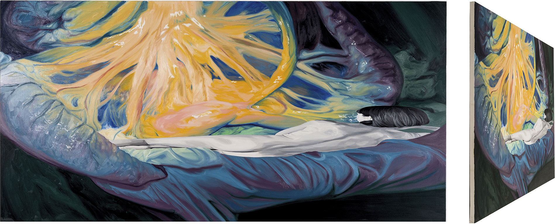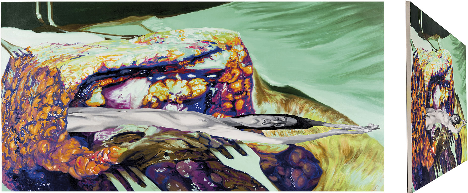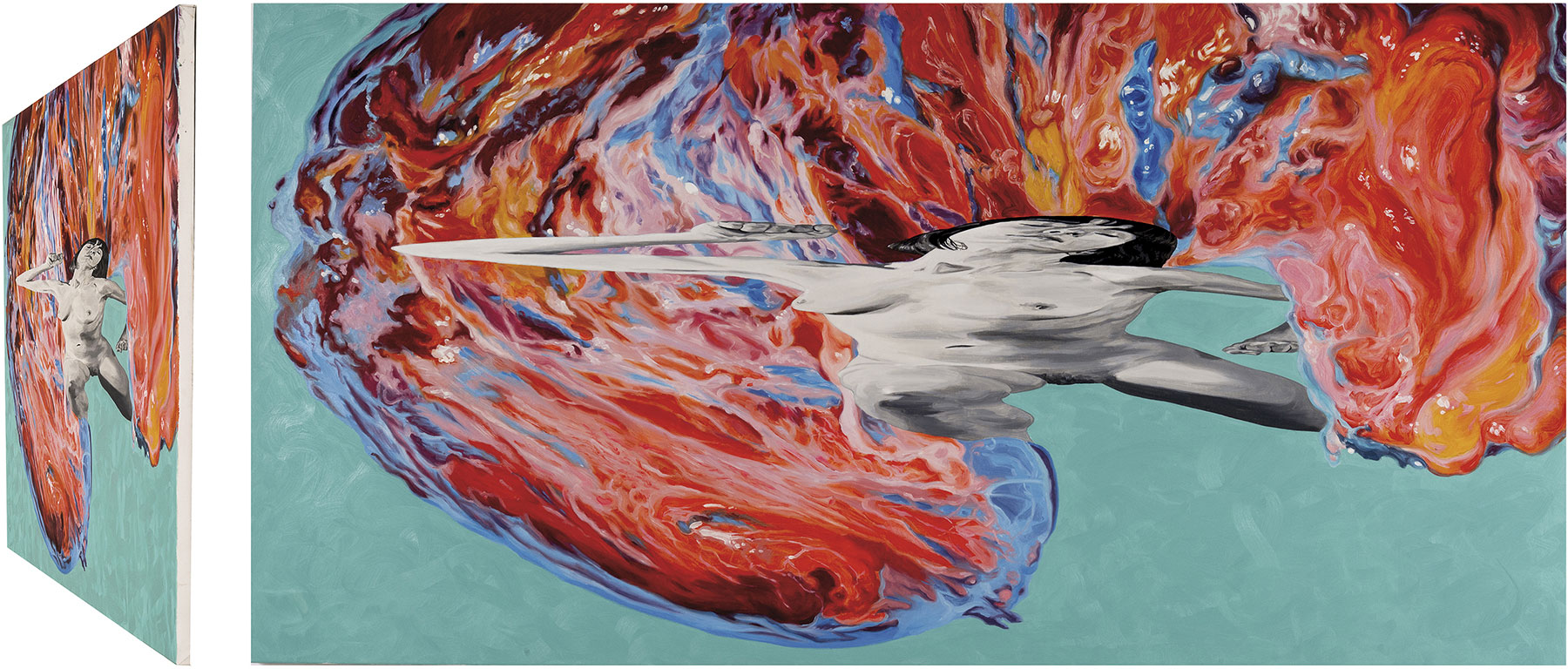 El primero, cuya huella es decisiva en su obra posterior, como ella va a contarnos, le llevó a exponer en Fernando Pradilla y a su residencia en La Térmica: Recreo obras de la historia del arte desde la Grecia clásica que representan mitos que hablan de la oposición entre parejas de contrarios, personajes que son rivales o amantes, pues a veces no hay una diferencia muy clara entre unos y otros. Las pinturas están protagonizadas por dos personajes, de los que uno aparece deformado mediante el recurso de la anamorfosis. Utilizo la deformación como una manera de enseñar sin mostrar abiertamente algo. Trabajando desde la figuración me planteo un cuestionamiento de la misma, empezando por una huida de lo explícito. Este recurso me permite también involucrar activamente al espectador en la obra, pues le invito a que se mueva y observe el cuadro desde varios puntos de vista, desde el marco, fundamentalmente, donde la imagen deformada se reconstruye y parece emerger del muro. Lo que queda en estas pinturas es una imagen fragmentada, sesgada, que no es posible asir completamente, que cuando la quieres atrapar en su totalidad se construye y deconstruye, se mire desde donde se mire.