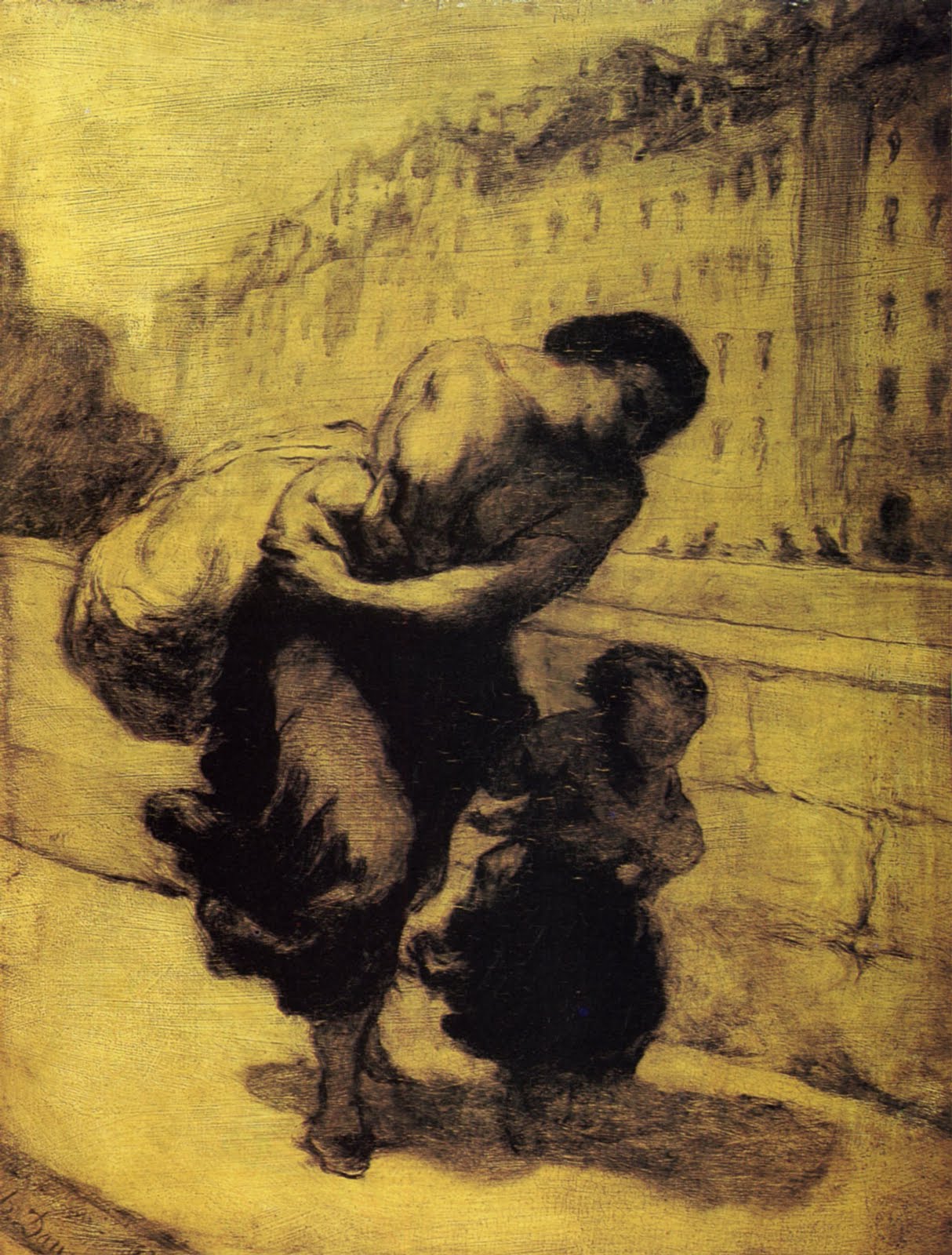 La conocida El fardo es una nueva crónica social urbana: una lavandera arrastra un pesado cesto mientras una niña se agarra a sus faldas, luchando contra el viento; se contrabalancea por el peso. Con pocos rasgos indica extraordinariamente el drama, el esfuerzo. Esta silueta de una madre joven sobre una pared iluminada repercutió en Toulouse-Lautrec, Picasso y otros artistas del siglo XX. Resulta semejante a su posterior Lavandera (1855), de luminosidad casi cegadora.