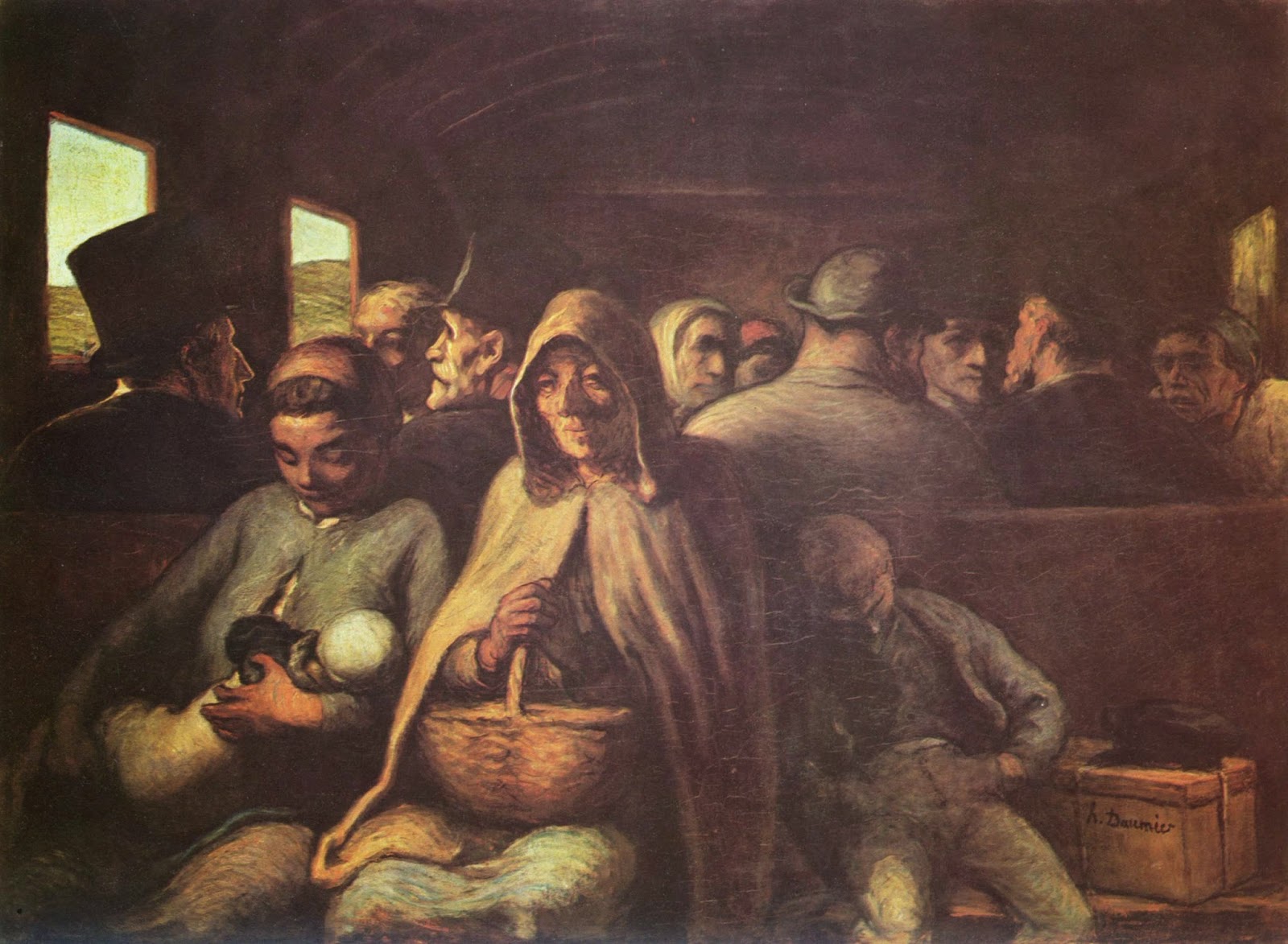 Uno de los escenarios patentes de la estratificación social decimonónica era el ferrocarril. Daumier se interesó por la clase popular que lo frecuenta en El vagón de tercera (1864) y esta, como otras tantas pinturas suyas, es en sí un tratado de sociología.