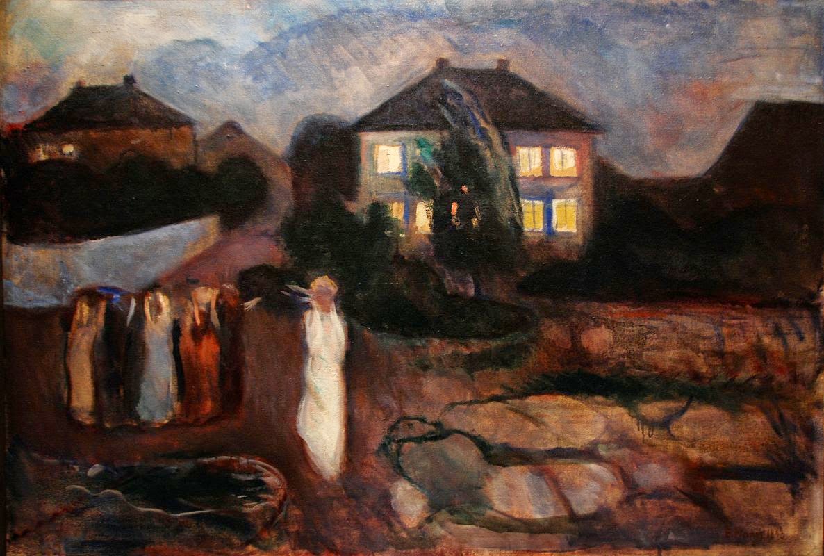 Munch consigue así transformar una dramática representación de la naturaleza, expresada por el viento levantado y el contraste entre el refugio que ofrece la casa y el misterio de la noche en un drama interior.