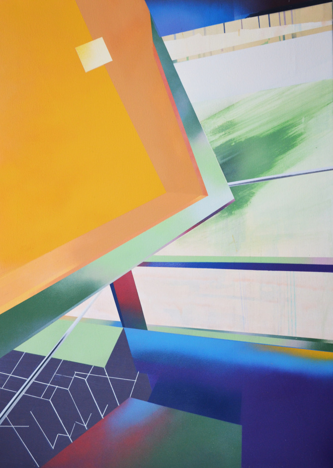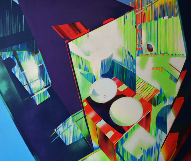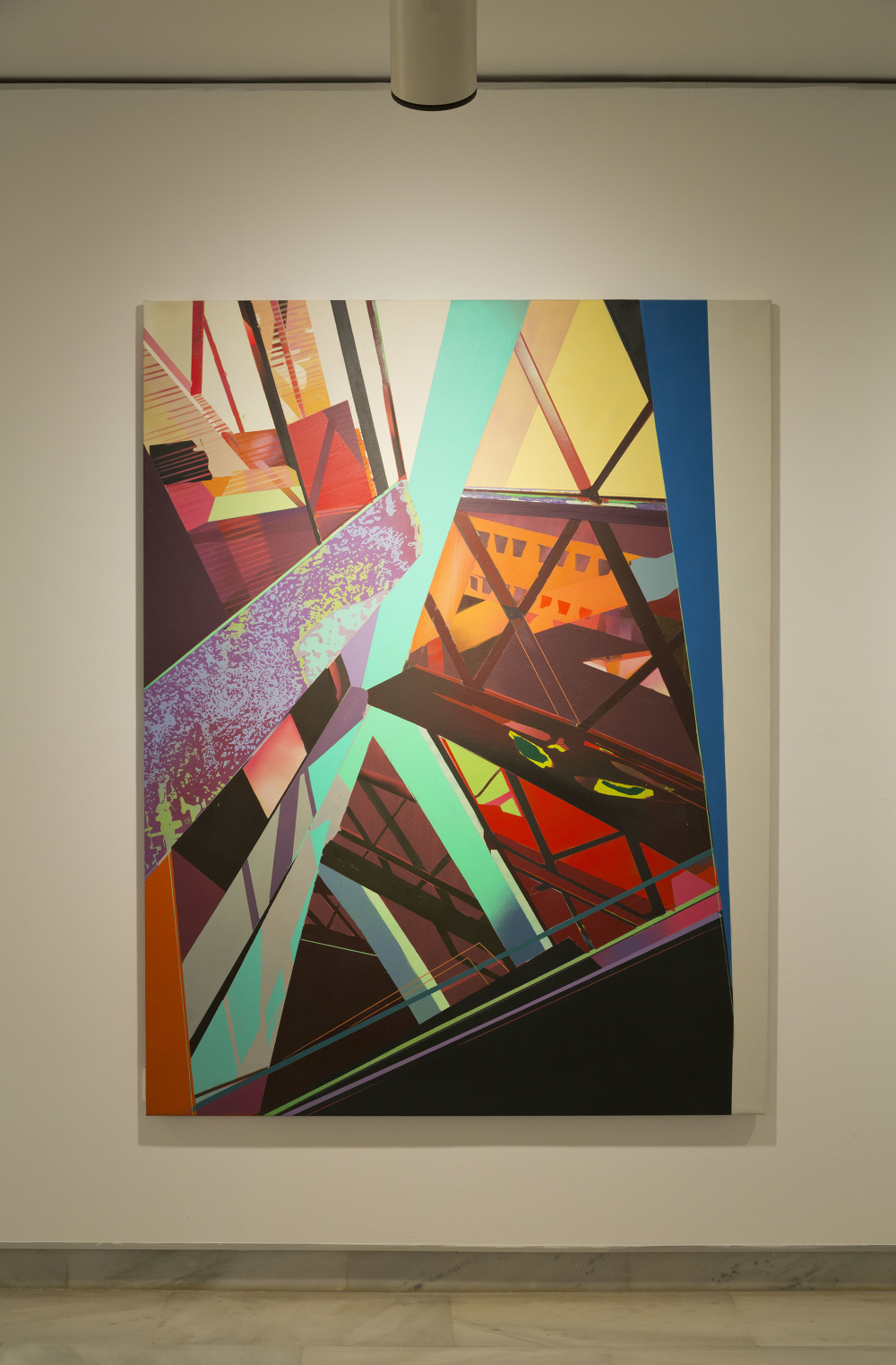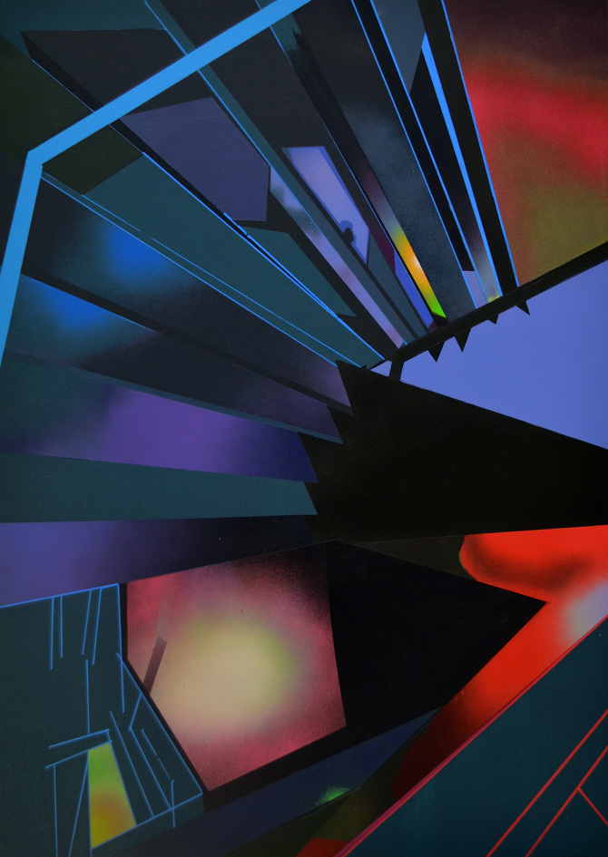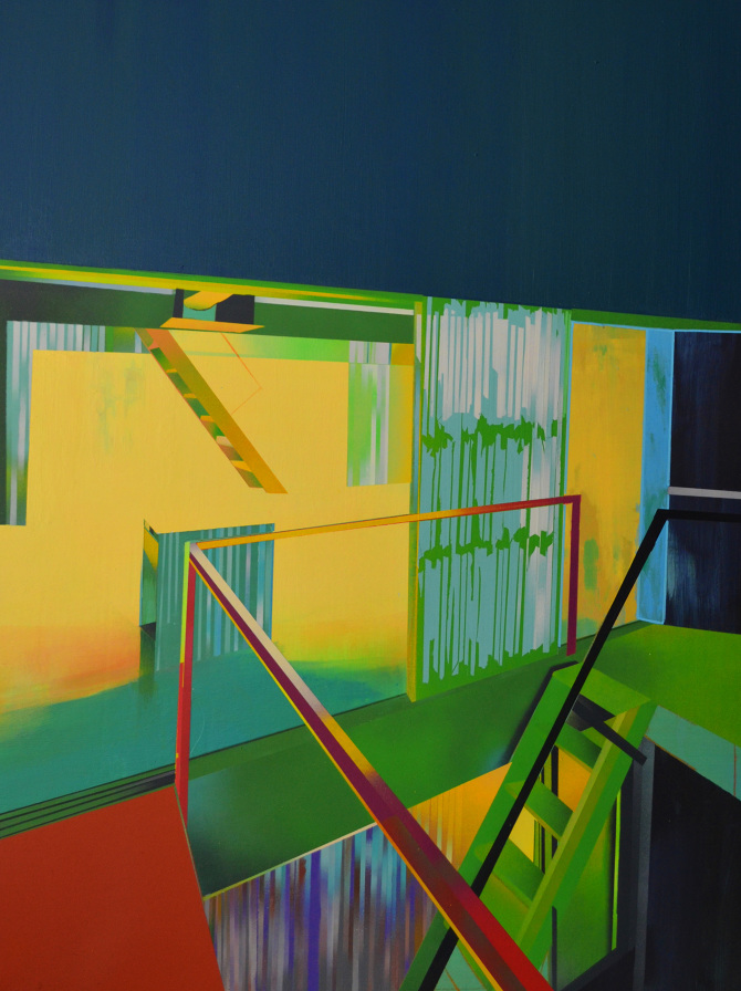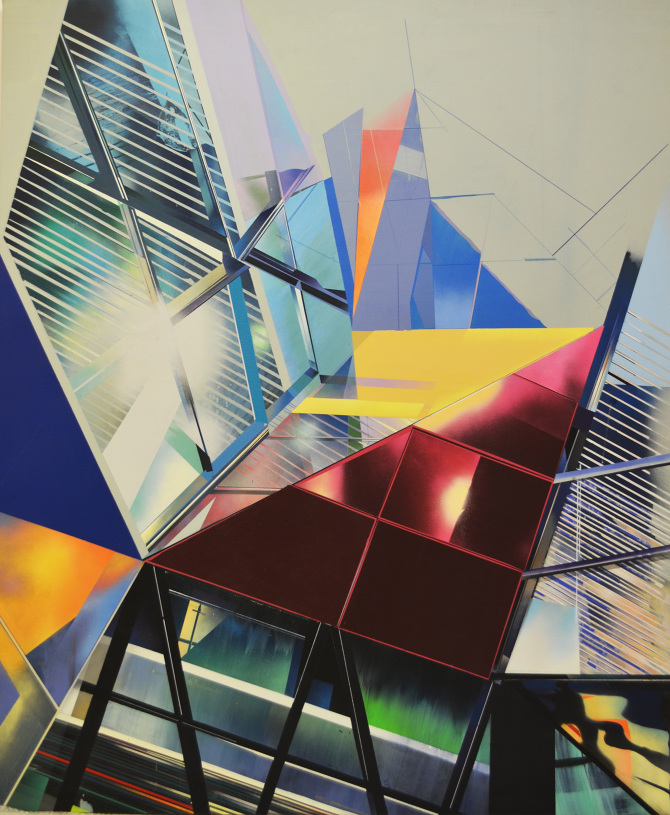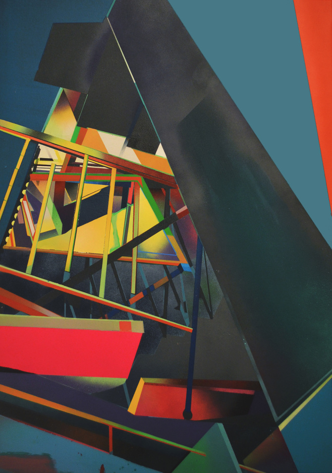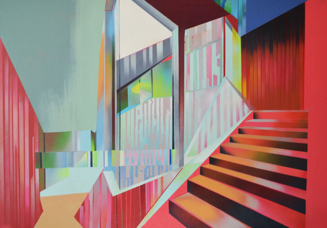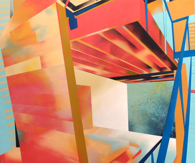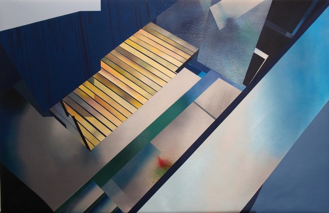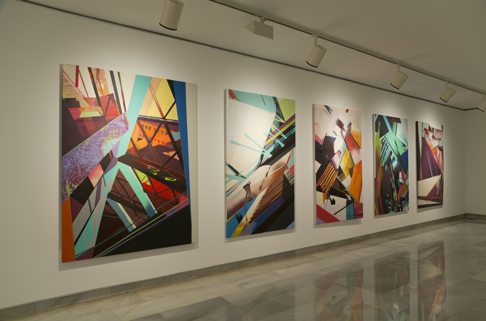 Esa combinación de elementos reales y distorsión derivaba en “Juegos de construcción”, pieza tras pieza (acrílicos y spray sobre lienzo), en una suerte de abstracción geométrica: sus colores cálidos iniciales eran sustituidos por gamas frías, la luz evolucionaba en ese mismo sentido y en la disposición de los elementos arquitectónicos se acentuaba cada vez más la geometría. La muestra transitaba de lo cotidiano a lo futurista.