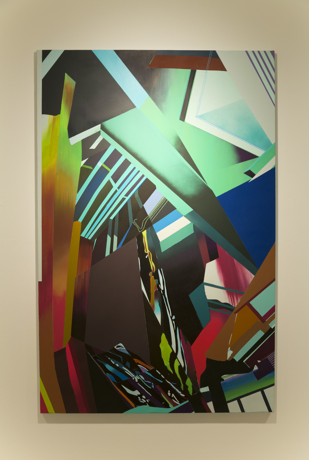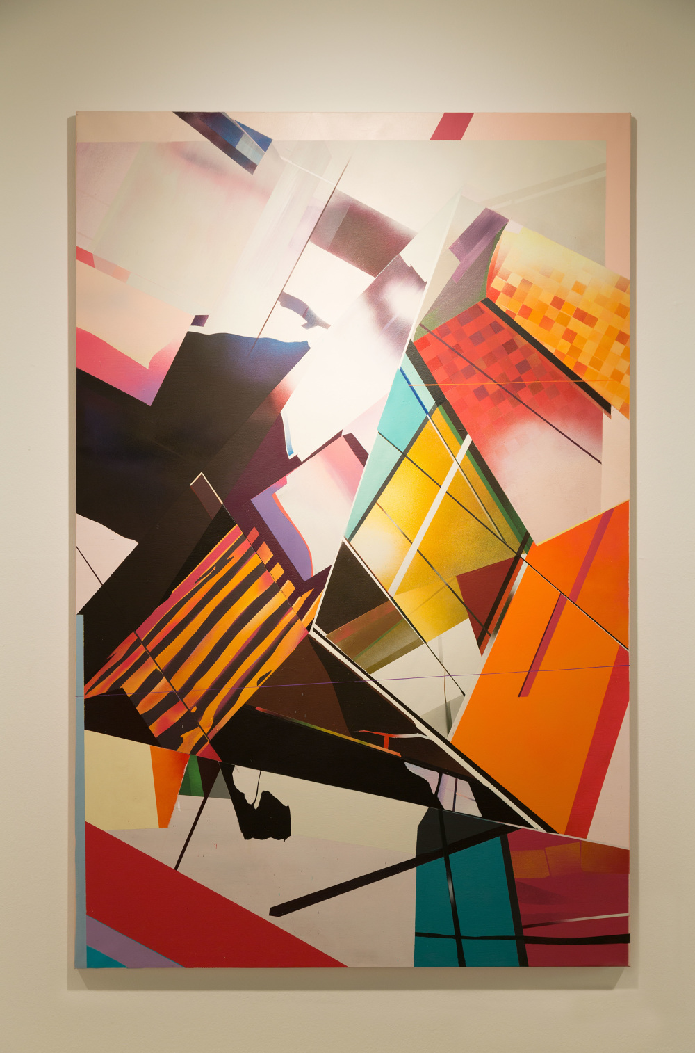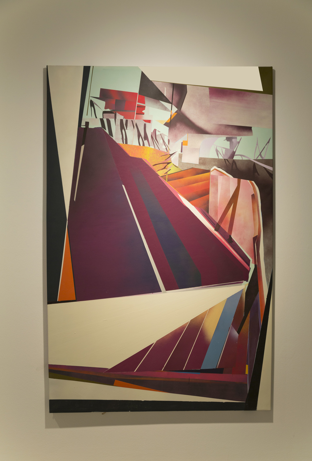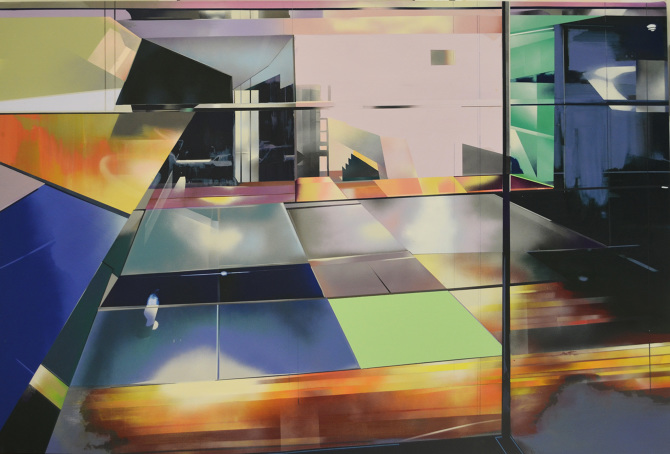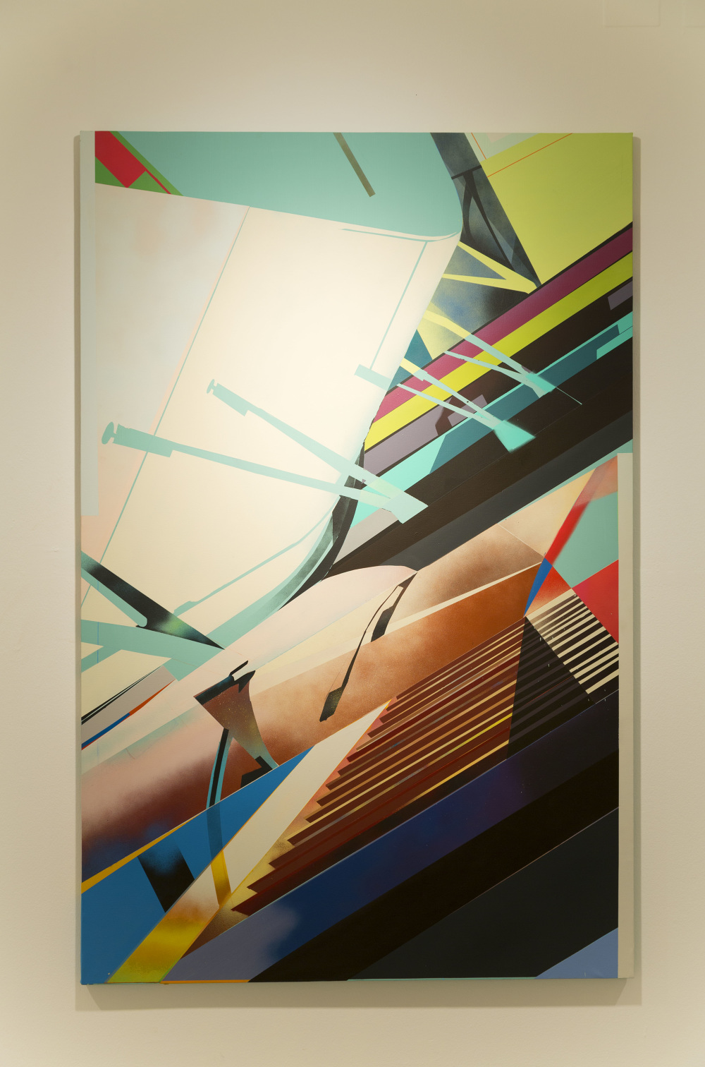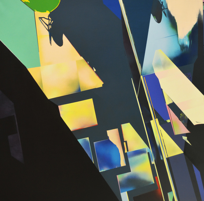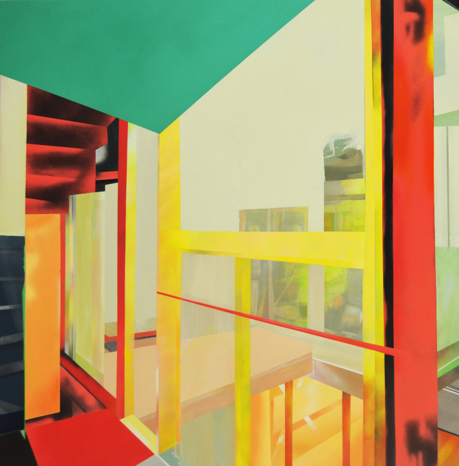Esa combinación de elementos reales y distorsión derivaba en “Juegos de construcción”, pieza tras pieza (acrílicos y spray sobre lienzo), en una suerte de abstracción geométrica: sus colores cálidos iniciales eran sustituidos por gamas frías, la luz evolucionaba en ese mismo sentido y en la disposición de los elementos arquitectónicos se acentuaba cada vez más la geometría. La muestra transitaba de lo cotidiano a lo futurista.