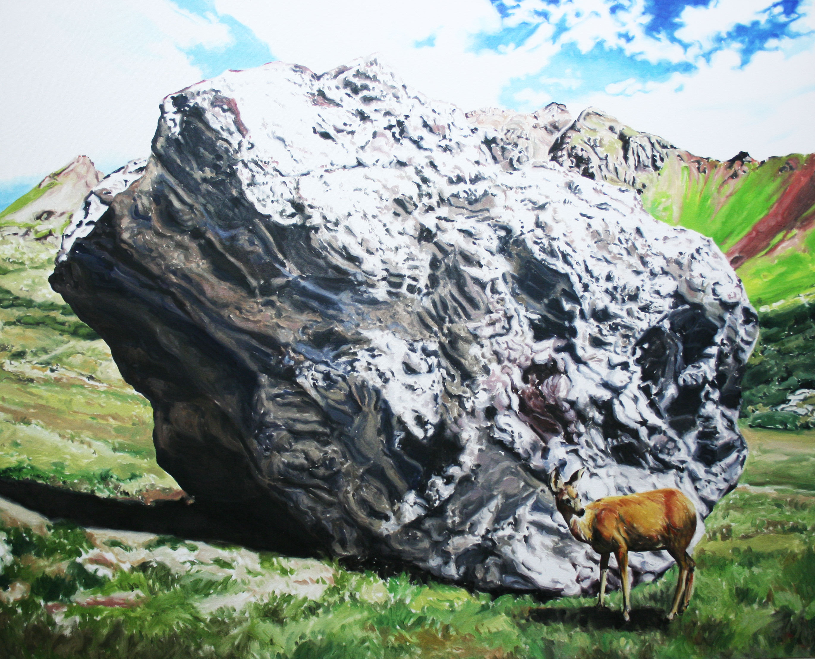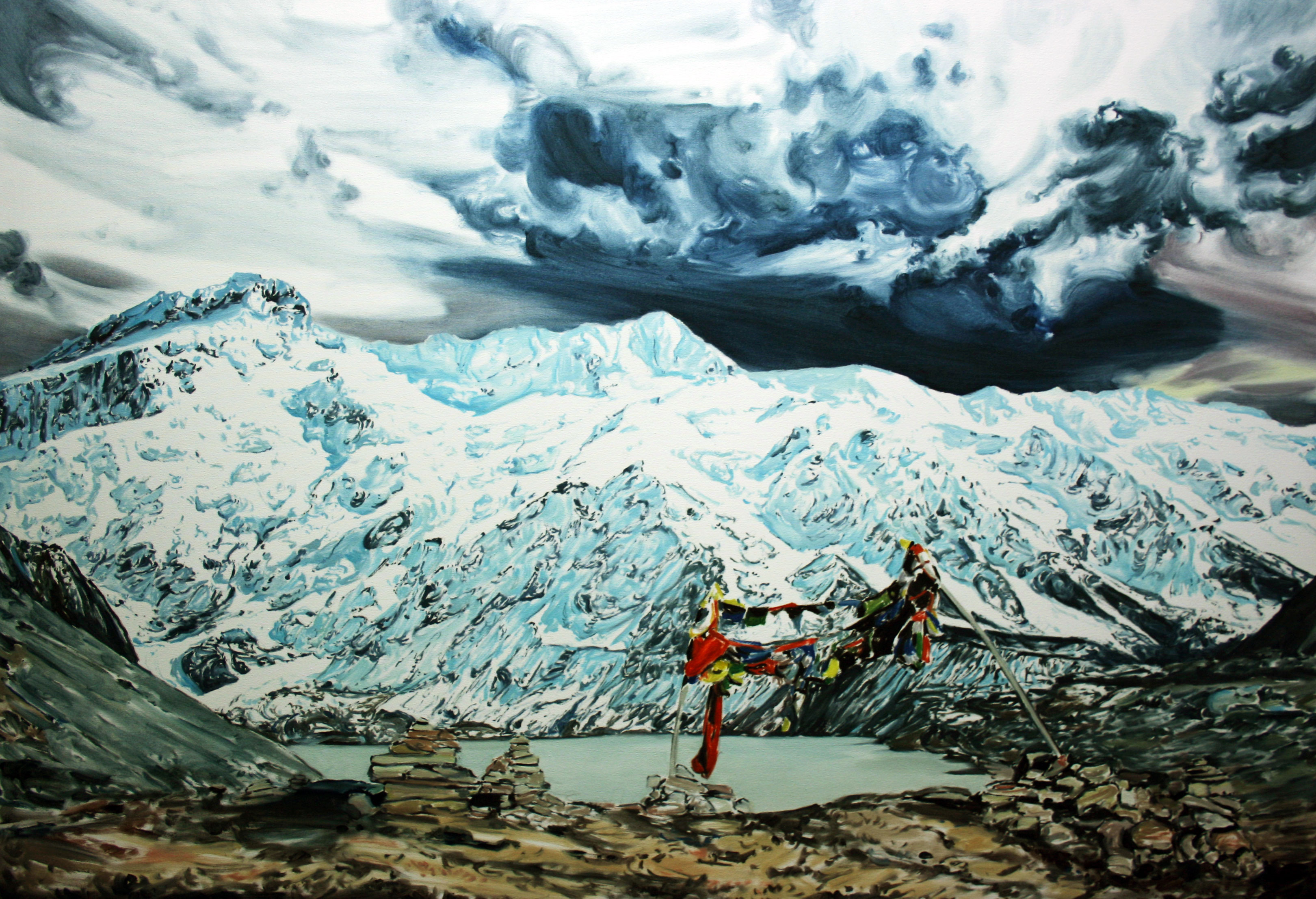 A las montañas les concede prácticamente una poética propia, fruto de reflexiones concienzudas y conmovedora a la vez: En mi trabajo todo gira en torno al paisaje autonomizado, que rechaza la preponderancia del factor humano y que reconoce la desvinculación entre éste y el hombre. Del mismo modo, esta escisión pretende evocar en el espectador no sólo el sacrificio destructor que se nos avecina, sino también una celebración de la belleza original y primigenia. En cualquier caso, una montaña, un tronco seco o un cielo parcialmente cubierto deben ser capaces de reflejar- plásticamente- estados subjetivos de la conciencia. Es una experiencia del límite que postula un vasto itinerario espiritual más allá de la objetiva representación, entendiendo la naturaleza como incesante nacimiento y destrucción de las formas e infinita conexión de las cosas, como ilimitada expresión visual de líneas y contornos. Las montañas suponen una violenta acción articuladora del territorio; omnipresentes en mi trabajo, es su aplastante e indolente masa la que me seduce (Thomas Burnet consideraba las montañas como amasijos de un mundo hecho añicos, como restos de un paraíso en ruinas). La altura -mis cuadros siempre suceden en alto- nos dirige a una cierta sensación de desarraigo de la vida que trasciende las formas y se redime: la altura como salvación.