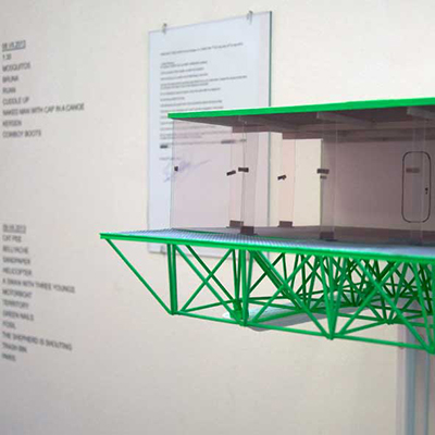 También el año pasado protagonizó Isabel en el CEART de Fuenlabrada una exhibición formada por tres de sus trabajos más significativos, muy distintos pero conectados por intereses comunes: Castles in Spain, Esta piedra contiene un viaje y Seis días viviendo en Fantasía. Del primero, ideado para los Circuitos de Artes Plásticas, ya os hemos hablado; el segundo, antes expuesto en BilbaoArte, tiene como protagonista a una piedra, de esas que encontramos en cualquier acera, con la que tropezamos o no, a la que miramos y olvidamos, o quizá recogemos, como Sara en esta videoproyección, para que nos haga pensar en todas las experiencias contenidas en un elemento tan rutinario y necesario como el pavimento. Seis días viviendo en Fantasía, por su parte, nos traslada a la ciudad más joven de Holanda, Almere, construida en terreno ganado al mar. Allí, en una parcela triangular llamada Fantasía, se asientan ocho viviendas sin planificación urbanística, una de ellas, la décima, semejante a una caja de vidrio levantada del terreno a través de barras metálicas. Se construyó para durar solo un lustro, pero sigue en pie, y Marcos la convirtió en símbolo de una Almere posible frente a la denostada apreciación de esta ciudad-dormitorio. En ese lugar pudo permanecer seis días y del nº 10 de Fantasía ha realizado una maqueta que se acompaña de notas de diario y del contrato de alquiler.