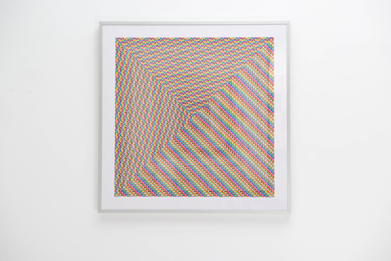 En su exposición en The Goma se sirvió de hojas de trabajo, cuadernos dibujados a mano, papel triturado y luego reciclado, pegatinas que le servían para definir una determinada mancha o corcho. El resultado era limpio y casi desnudo; los colores, medidos. Huellas y papel.