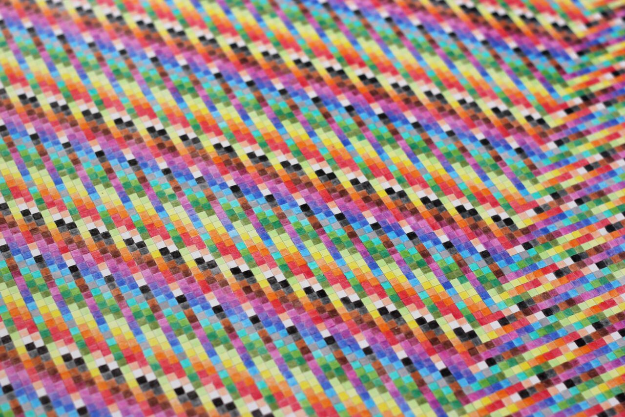 Como ya habéis podido ver, la pintura es su técnica de trabajo habitual, pero no en un sentido canónico. Y tampoco hablamos de pintura expandida, Isabel sigue caminos propios: Me muevo dentro del lenguaje pictórico, aunque no utilizo métodos tradicionales como sería el uso de caballete y pincel. Normalmente trabajo con materiales cercanos y convencionales, como lápices de colores, bolígrafos y papel. Me interesa trabajar, sobre todo, con formatos estándar y materiales que se pueden encontrar fácilmente en tiendas no especializadas.