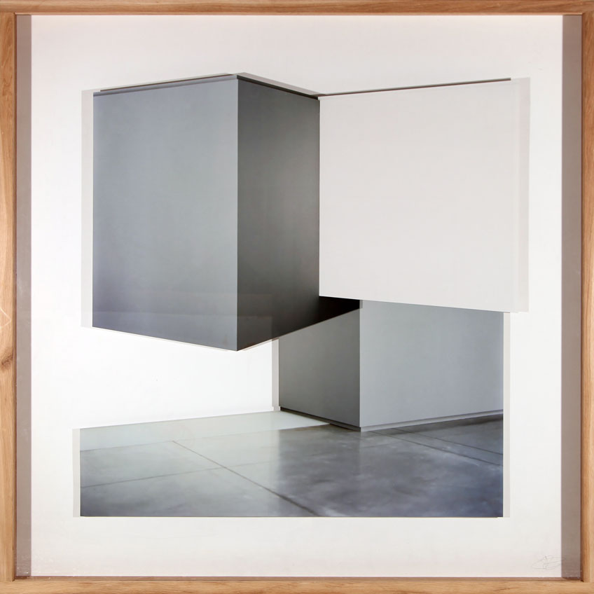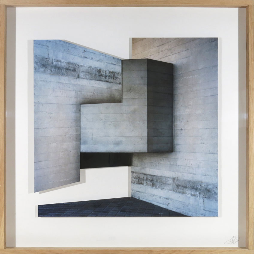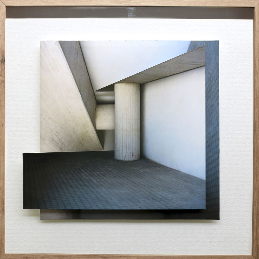 La fotografía es su medio de trabajo y se centra en explorar sus opciones perceptivas de tridimensionalidad con Chillida y Jerry McMillan como referentes. Ese proceso que podemos llamar de “esculturización” de la imagen le ocupa desde hace, más o menos, diez años, cuando finalizó su carrera. Avisamos: a veces conviene acercarse bien a su obra para encontrar volumen donde, desde la cierta lejanía, hay planitud. Nos lo explica: Llevo una década de investigación sobre la fotografía como objeto tridimensional, desarrollada desde la percepción de la arquitectura. Dicha idea nace al plantear un juego cercano al de las “Gravitaciones” de Eduardo Chillida, desarrolladas en los años noventa, o el de los estudios con fotografía recortada de Jerry McMillan (con su famosa pregunta “¿Debe la fotografía ser plana?”), pero con el matiz de que la materia prima con la que cuento son fotografías de arquitectura realizadas por mí mismo. El matiz es importante, porque mientras que Chillida usaba papel (blanco o pigmentado en negro) y McMillan fotografías veladas (o, en todo caso, fotografías de pliegues o arrugas), mi idea parte de elementos en los que el ojo del espectador ya proyecta una tercera dimensión, aunque no esté allí.