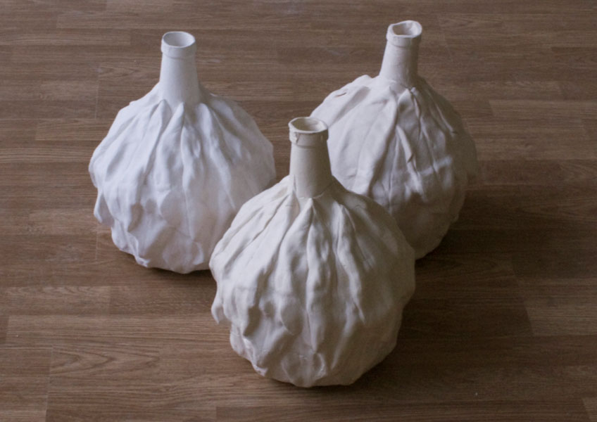 Y el año pasado comenzó también la artista a trabajar en una acción corporal y cerámica (fotografiada por Alfonso Álvarez) en la que entrelazaba pasado y presente; naturaleza, cerámica e industria, tan enraizada en el paisaje bilbaíno que tiene cerca: Las garrafas de vidrio o damajuanas son objetos entre la artesanía y lo industrial, que actualmente han caído en desuso. Elegí cubrir estas damajuanas con hojas del árbol magnolio. Importados de América del Sur desde la colonización, sus usos a lo largo de la historia han sido diversos, especialmente para la decoración de jardines. En las culturas indígenas adquirían una serie de valores sagrados y rituales; en Europa, sus grandes y exuberantes flores fueron utilizadas para usos médicos especialmente relacionados con el cuerpo de la mujer.