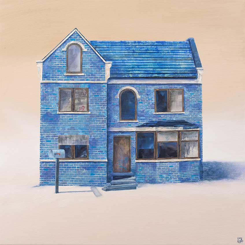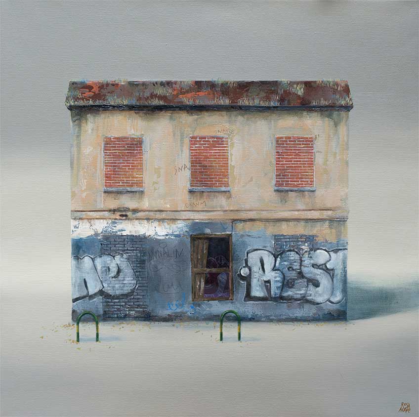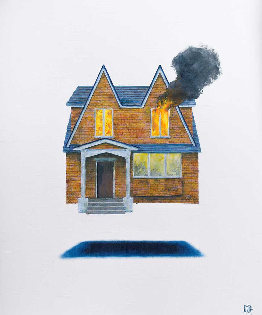 Exteriores de viviendas no especialmente acogedoras componen el grueso de la producción reciente de Rosa Álamo, que también ha bebido de fuentes literarias o cinematográficas. Entiende esos hogares como la suma de espacios y emociones y su acercamiento a los mismos evoca rasgos del surrealismo o el Pop Art. Ventanas y puertas tapiadas, casas en llamas y entornos inhóspitos hablan de estados de ánimo y ejercen cierto contraste con el libre albedrío de aves y gatos dispersos que no necesitan paredes decadentes donde esconderse. ¿Por qué el dibujo? Me gusta mucho trabajar en lienzo, pero también sobre papel. El comenzar a indagar hace unos cuatro años, más en profundidad, en las posibilidades que para mí podían tener el dibujo y la ilustración me llevó a sentirme muy cómoda sobre los papeles de acuarela con gramajes y texturas diferentes.