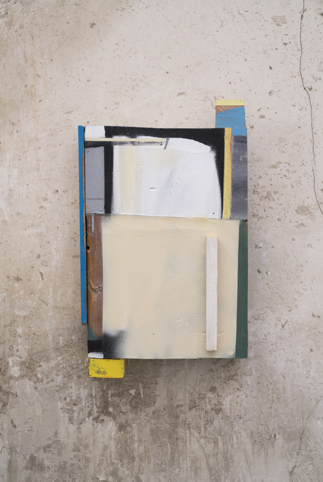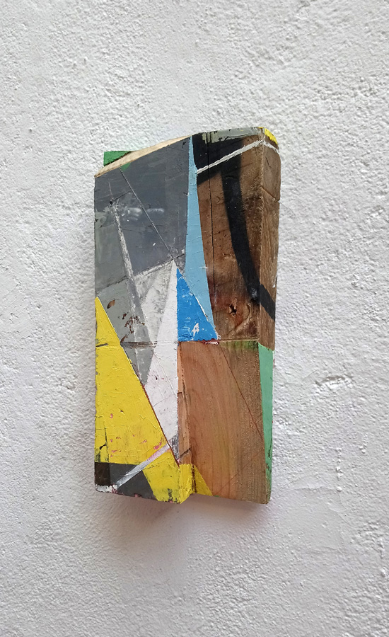 En su presentación en Aurora Vigil, leemos que Sergio recorrió en su infancia frecuentemente los astilleros que le eran cercanos; en aquellos paseos seguramente se halla el origen de su interés por los materiales usados, con la historia propia que no tienen los nuevos, ligada a un tiempo y un lugar. En su producción veremos a menudo maderas encontradas que interviene y reutiliza para generar objetos artísticos, por eso hemos de atender en ellos a las hendiduras, las texturas, las pequeñas huellas. Tras ese “reciclaje” subyace una llamada a la reflexión sobre nuestro consumo voraz; conjuga el artista su observación atenta al momento actual con su vocación de ahondar en las bases del lenguaje pictórico más allá de convenciones: Mi obra parte de un trabajo autorreferencial, la pieza que se representa a sí misma; todo se sustenta bajo una serie de planteamientos estéticos y estilísticos, como pueden ser la escala, el carácter físico del soporte, la tridimensionalidad, la superposición, el color ligado a la forma…