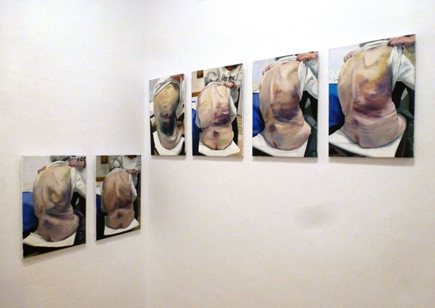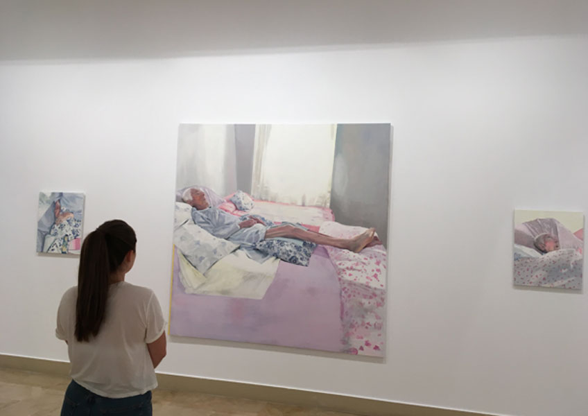 No es extraño que, a la hora de citar sus referencias, al margen de que conozca bien la obra de pintores de la carne como Bacon o Freud, elija las más cercanas, las familiares. Podemos decir que encuentra inspiración en las personas con experiencia de vida y en sus propias vivencias: Mi principal influencia es la propia vida, mi propia vida y lo que me rodea. Nada más natural que el vivir y el morir. Mi abuela María del Valle fue el germen de todo mi trabajo. Con ella fui estrechando cada vez más mi línea de investigación pictórica. Mi madre es una influencia muy fuerte en mi trabajo también; vengo de una familia muy matriarcal y eso me ha marcado como persona y como mujer. Desde pequeña recuerdo a mi madre cuidando a mi padre, luego a mi abuela y casi a la par, se formó como auxiliar de clínica y comienza a trabajar en una residencia de ancianos. Eso fue un gran giro de tuerca en mi trabajo y la prueba que me hizo tener todavía más clara la idea de dedicar mi investigación a ellas. Son especialmente bellas las pinturas en las que ella misma aparece observando a su modelo, como estos mapas interiores:
