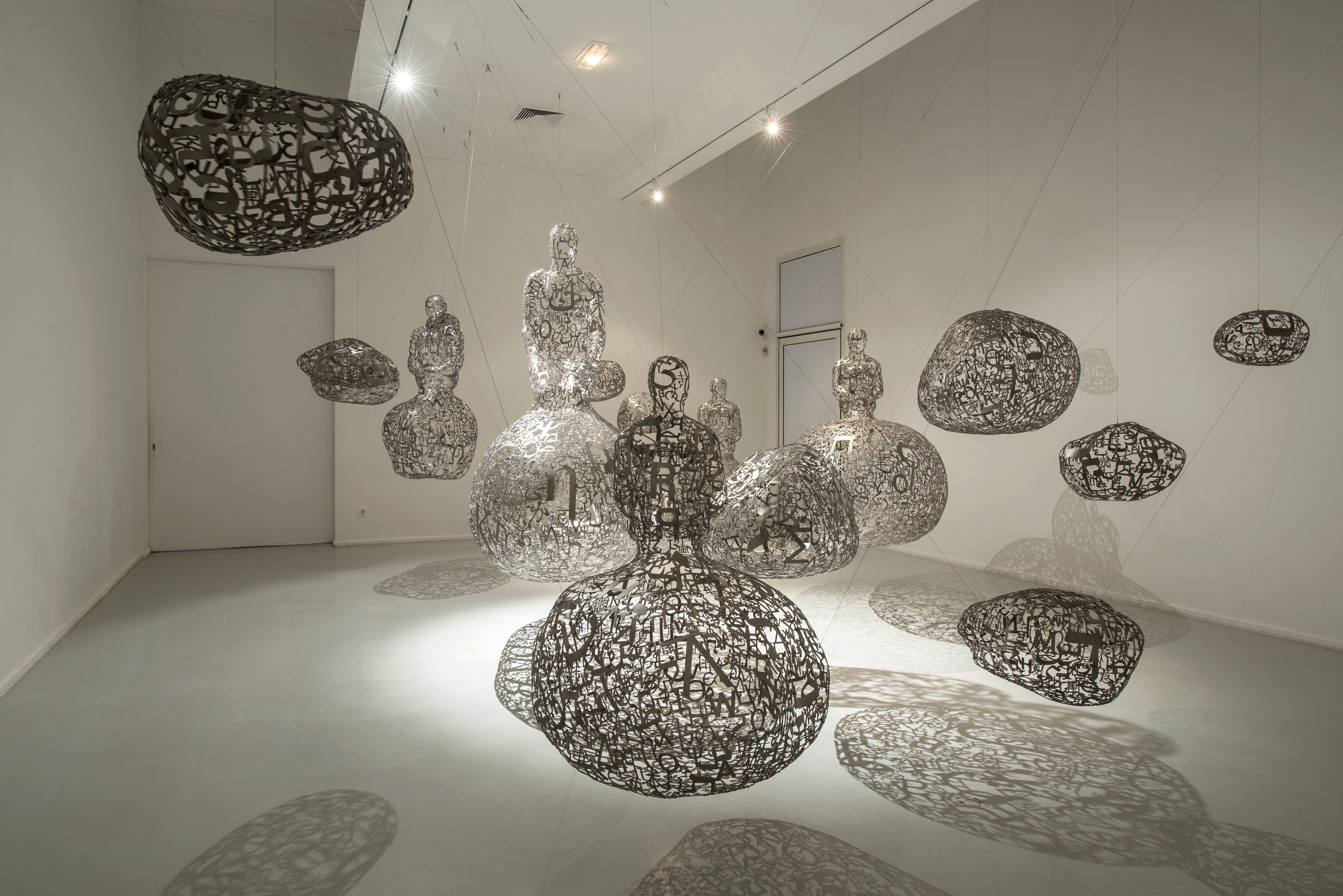 La muestra lleva por nombre “El silencio del pensamiento” y la componen tres instalaciones y cinco de sus conocidas caras monumentales. Destaca Silhouettes (2011-2012), un conjunto de dieciséis siluetas de acero suspendidas en el aire, colgadas del techo por banderolas con lemas y versos de poemas que el propio artista ha escogido, entre ellos “Un pensamiento llena la inmensidad”, un verso de William Blake que el artista cita como fuente de inspiración de su trabajo. De tamaño natural, las siluetas pueden confundirse en la sala con la de los visitantes que pasean sin cortapisas entre las figuras y las sentencias.