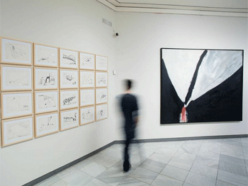 El recorrido de la exposición en cinco secciones nos permitirá aproximarnos a sus obras fechadas a finales de los cuarenta, tras llegar a Estados Unidos, fase en la que se inició en el grabado; a su evolución de las bioformas al gesto en la primera mitad de los cincuenta, a los murales en los que trató de integrar en la pintura materiales propios de la construcción, como uralita, ladrillos o cemento (él los llamaba frescos portátiles); a sus trabajos más próximos al Expresionismo Abstracto, en los que el negro que da título a la exposición suma su fuerza dramática a la de otros colores más provocativos, y por último, contemplaremos el resultado de toda la evolución de su periodo americano en las obras que llevó a cabo tras su regreso a España, en 1965.