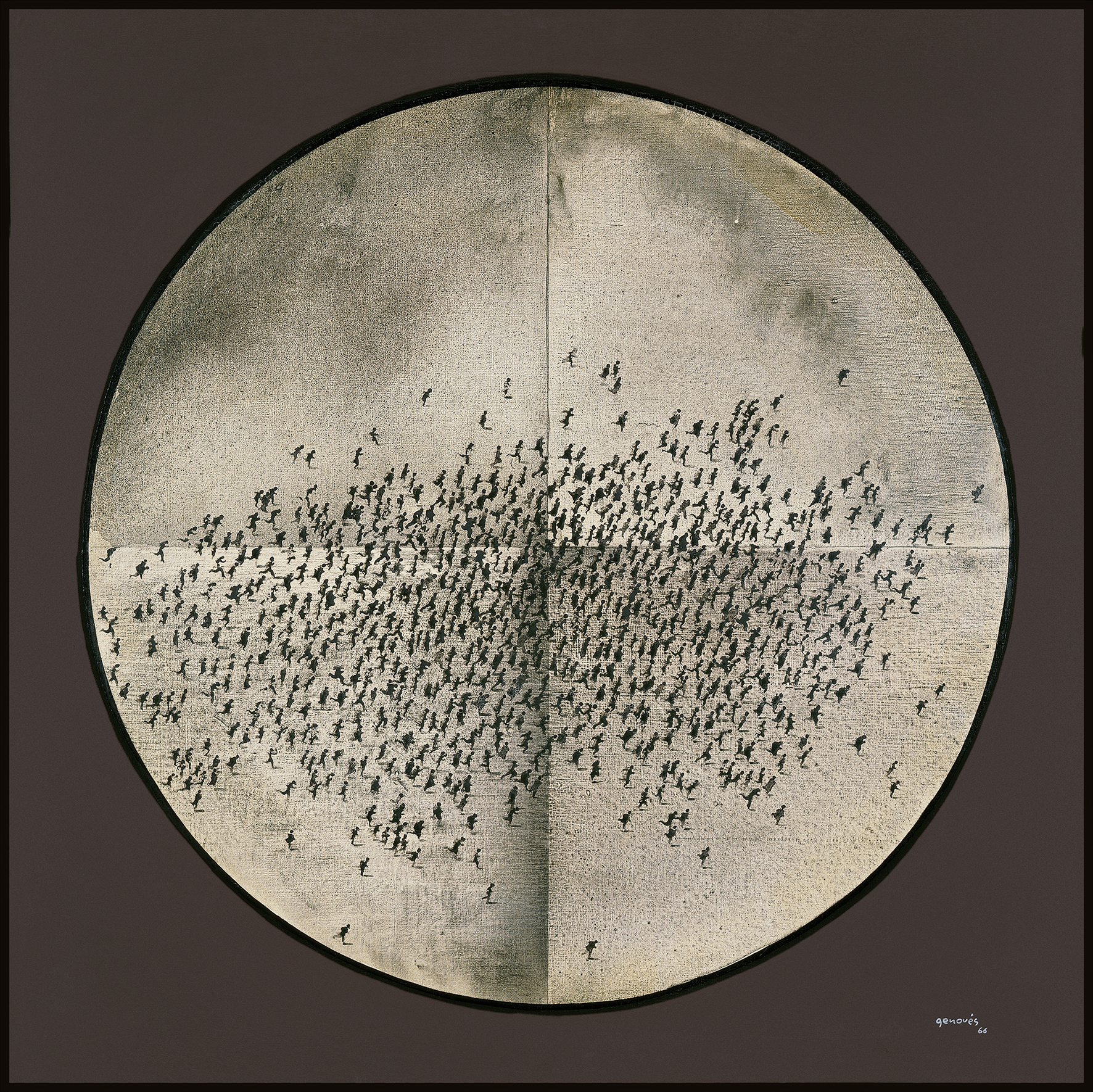 A la hora de estudiar la vanguardia española de posguerra, es inevitable estudiar la figura de Juan Genovés, el artista valenciano al que comúnmente recordamos por su producción de los setenta, neofigurativa y comprometida con las libertades en la etapa franquista. Comenzó a ser conocido a partir de una controvertida exposición en la Biblioteca Nacional en 1965, seguida por su participación en la Bienal de Venecia del año siguiente, pero había iniciado su trayectoria artística a comienzos de aquella década, de la mano del Grupo Hondo, que propugnaba una pintura neofigurativa de lenguaje próximo al Expresionismo que también se sirvió de técnicas propias del Informalismo.