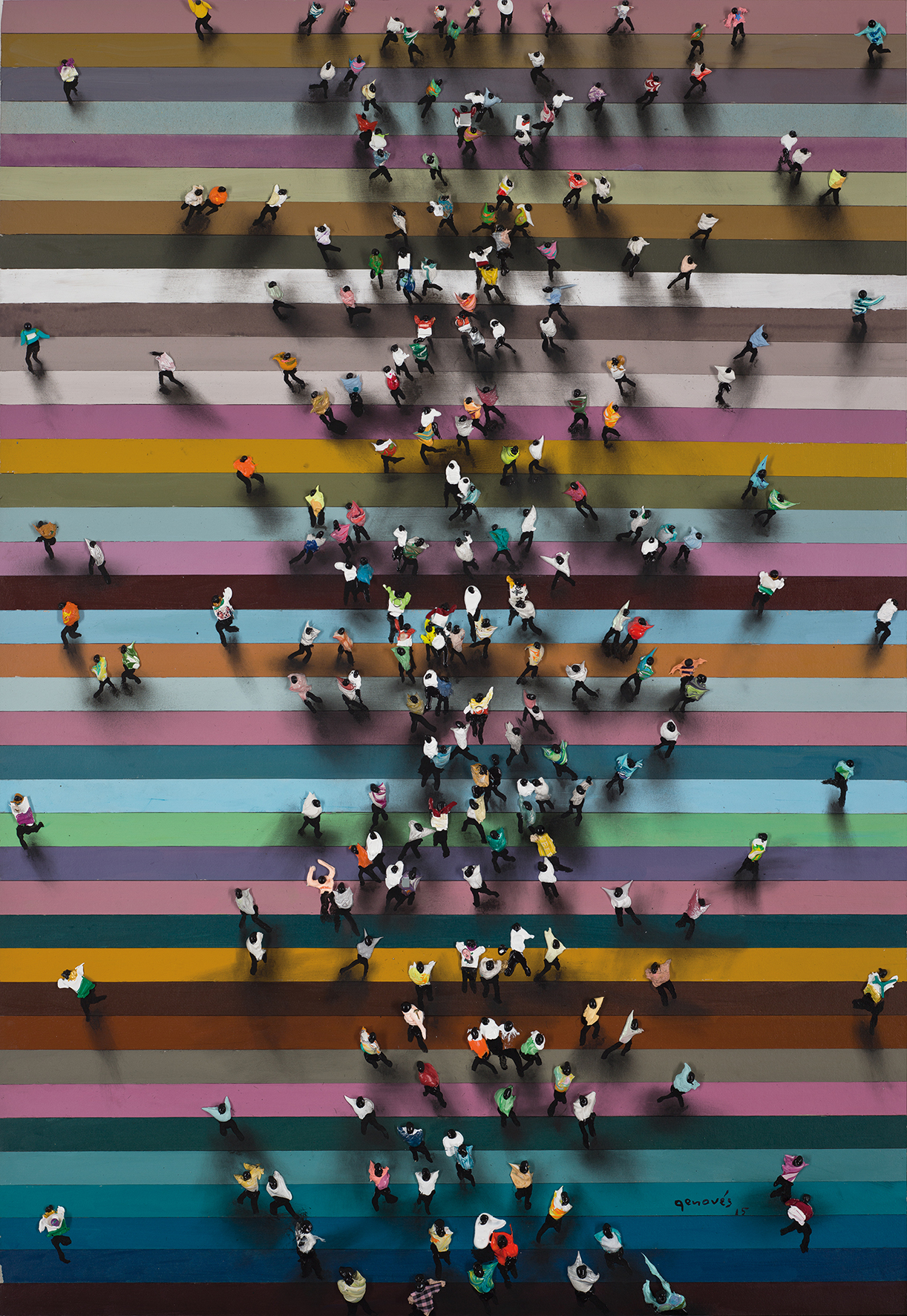 Más adelante, a medida que avanzaba la década de los setenta, la obra de Juan Genovés ganó en la viveza de su cromatismo y en el tratamiento, más complejo, del espacio pictórico entre las figuras, que en ocasiones ordenaba a partir de franjas verticales que distinguimos por su color, y otras veces a partir de tonos grises.