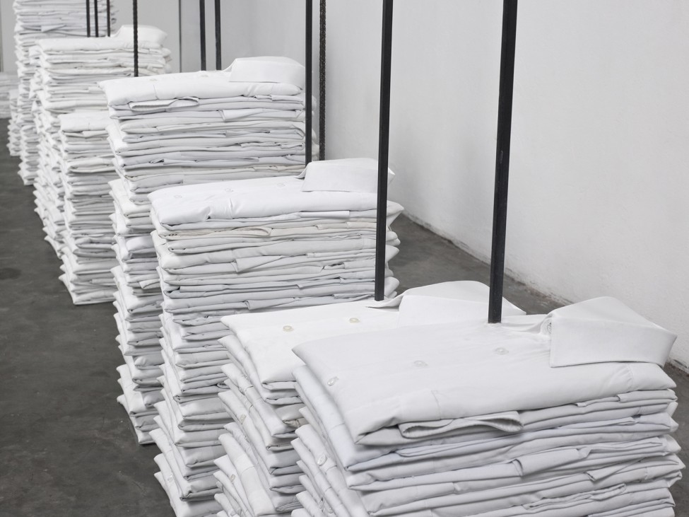 La exposición viaja a la Solomon R. Guggenheim Museum este verano, pero tenemos también a Salcedo algo más cerca: el Museo Thyssen-Bornemisza exhibe, hasta el 24 de mayo, Sin título, una obra suya de su primer periodo elaborada con camisas blancas delicadamente dobladas y almidonadas con yeso, apiladas y ensartadas en las varas metálicas que se alzan a diferentes alturas de las que hablábamos antes. Salcedo propuso aquí una escultura simbólica capaz de establecer una comunicación con el espectador tanto a nivel físico como espiritual.