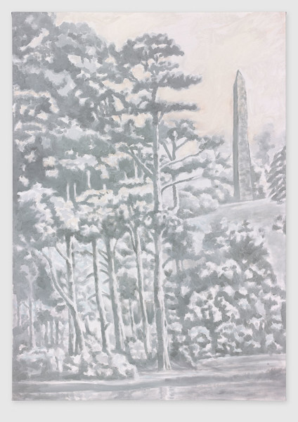 La intensidad de estos retratos en primer plano se contrarresta con la monocromía de dos pinturas situadas junto a ellos que representan, respectivamente, un obelisco situado en un paisaje boscoso y una gruesa nube. Para estas piezas, el belga se inspiró en los papeles pintados de un hotel de lujo de Edimburgo: escenas serenas cuyo exacerbado esteticismo, en opinión del autor, parece sugerir como la indiferencia o el aislamiento de ciertos grupos sociales puede estancar las ideas de quienes defienden ideas avanzadas de cara al futuro.