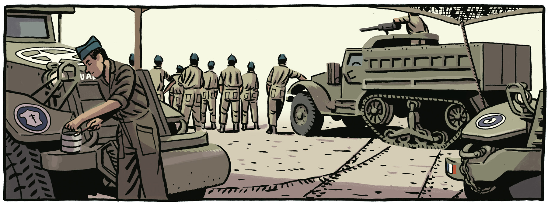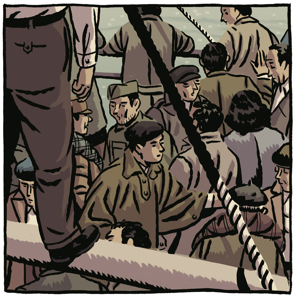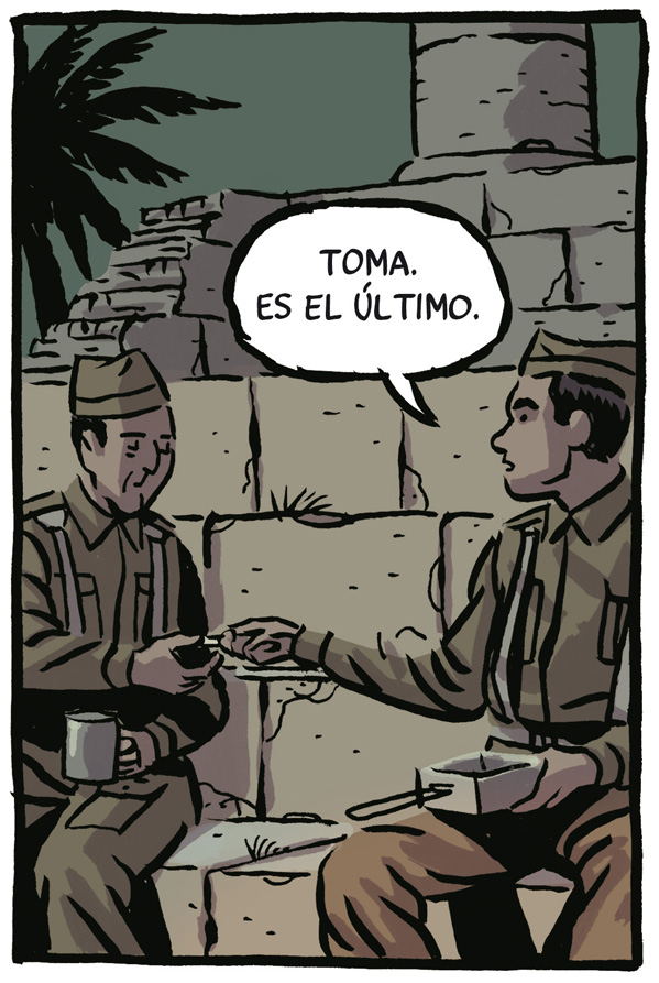 Hasta el próximo 4 de julio, Las Naves de su ciudad natal exhiben el último proyecto del artista, dedicado a los republicanos españoles que en la II Guerra Mundial (1944) lucharon en Francia para liberar París del nazismo. El proceso de creación de “Los surcos del azar”, que así se llama este trabajo, comenzó hace más de dos años con ideas, continuó con una fase de lectura de textos e imágenes de la época, consultas a historiadores y documentación y terminó con la creación de dibujos y la redacción de los textos definitivos. Narra el periplo que muchos exiliados siguieron tras huir en el Stanbrook desde Alicante, adentrarse en los campos de concentración franceses del norte de África, luchar después en el desierto contra Rommel y el Africa Korps, desembarcar en Normandía formando parte de la división Leclerc como La Nueve, a las órdenes del capitán Dronne, y por último llegar hasta las puertas del Nido del Águila, refugio del nazismo.