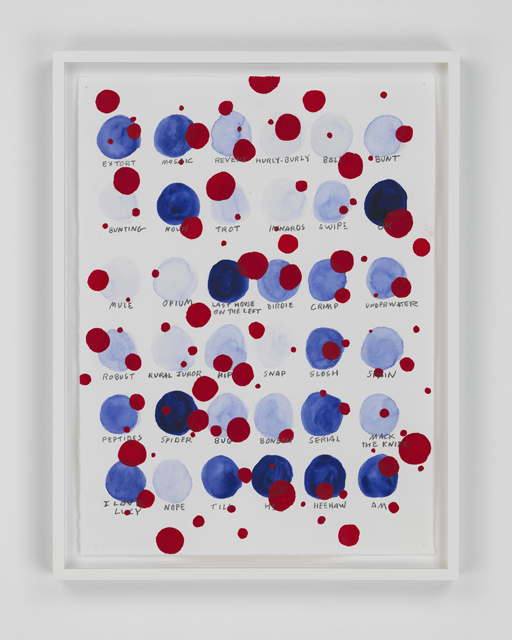 Por último, Remembered Words nos evoca llamativamente insectos. Presenta secuencias de rejilla sobre hojas gouache, cada una con una única palabra transcrita debajo. El sistema de la artista para agruparlas se basa en una similitud de significado o en su maleabilidad fonética. De algún modo sus asociaciones de palabras pueden relacionarse con la metodología experimental de la poesía de Gertrude Stein.