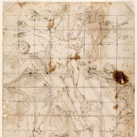 Este dibujo del artista toledano Cecilio Pizarro forma parte de un álbum con casi trescientas obras suyas sobre papel que el Prado adquirió en 2009. Pizarro lo llevó a cabo directamente sobre una página del álbum, en su margen derecho. Fue pintor, dibujante, aguafortista, litógrafo, y restaurador y dibujó más monumentos que estudios corporales, pero en estos también demostraba finura.