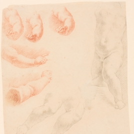 Lappicola no es un pintor muy conocido, aunque recibiera en 1750 el premio de la Academia de San Lucas y fuera académico de esa misma institución (también alumno de Fancini). No nos ha llegado demasiada obra suya, pero la que conocemos es estilísticamente semejante a este dibujo, de clara tendencia académica romana. Con lápiz negro y sanguina sobre papel agarbanzado ejecutó estos apuntes de brazo izquierdo y pierna izquierda en distintas actitudes. Todo delicadeza.
